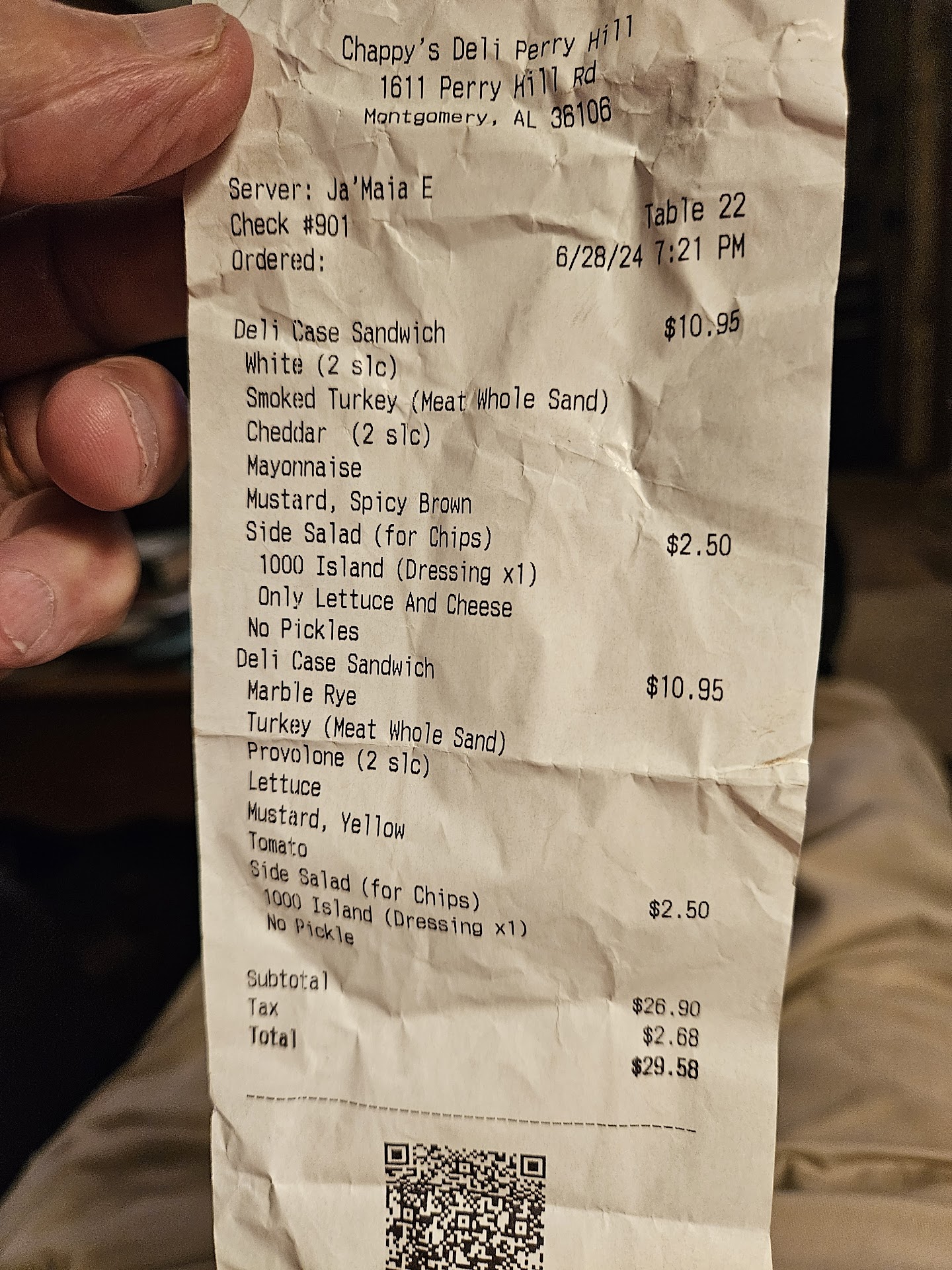 One of our favorite places to eat. I have been ordering the take 2 for 10.95. I get a half turkey sandwich and the side salad. My wife ordered same thing tonight, and everything was going great till they brought out a whole sandwich. Said we ordered off the deli sandwich not the take 2. Said we had to order off the menu on a sandwich like chicken salad, grilled cheese, or one of the listed sandwiches to get that special. It says on that take2, deli sandwiches, grilled cheese and chicken salad. I realize waitress was new and so was manger. Just a little confused and they got menu and we showed them what we ordered and they still said we had to order a different sandwich than the turkey??? They said we could have the extra half since they would just throw it away, and they they would not charge us for our tea to make price right. Ticket had 2 10.95 take 2, plus 2 salads for 2.50 each. Salad should have been included. Worked out about the same price. Ja'Maia E. She was very nice and did a good job, just didn't seem to know the menu as we pointed to the take 2...