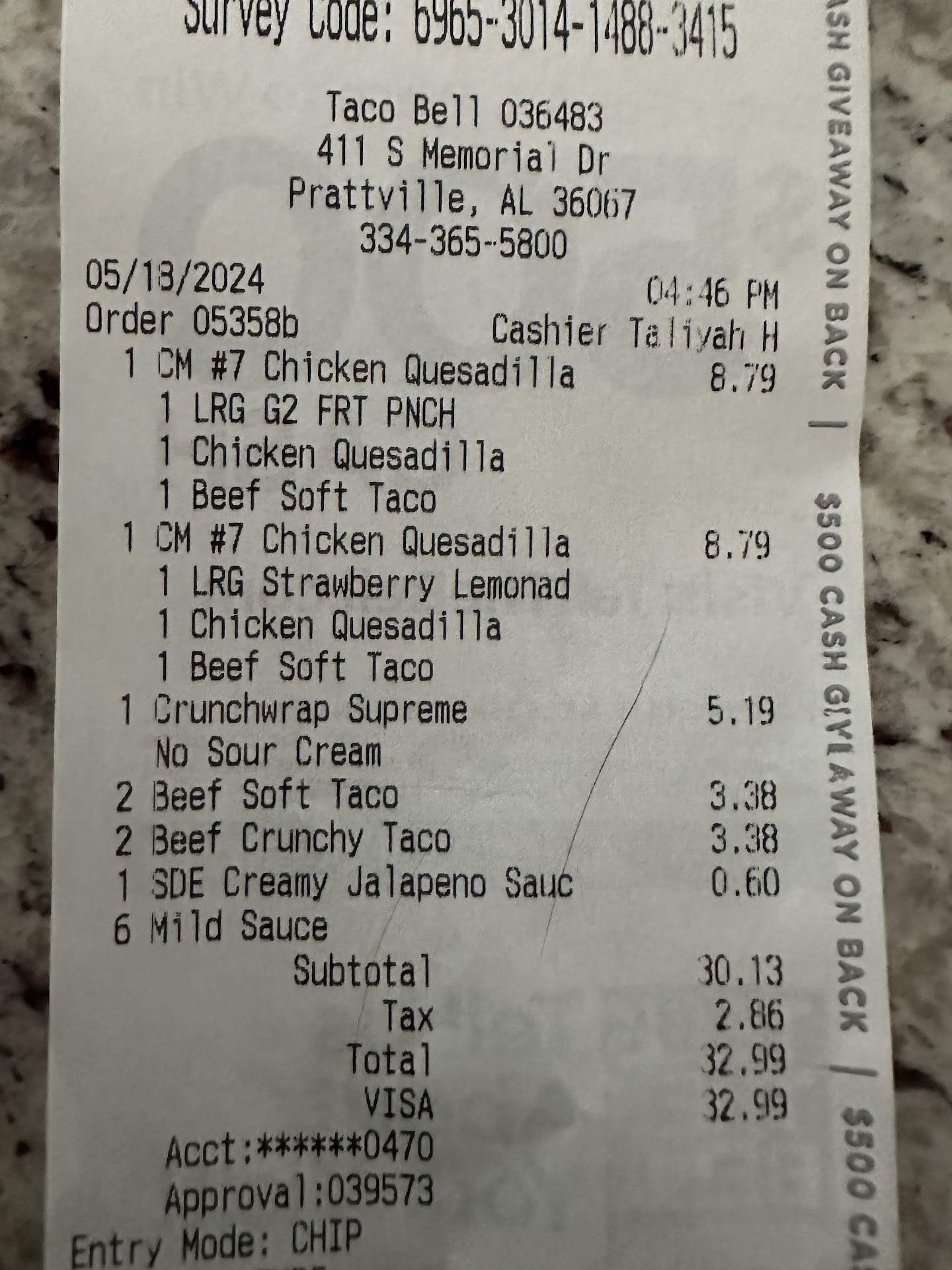 Ā Ā Ā Read moreMost of the time this location is decent but last night I was highly dissatisfied. I was at the ER with my husband and he said he was hungry and it was about 15 minutes until close so I drove across the street and they had the lights all turned off on the menu but let me order anyway. I ordered a number 3 with no tomatoes, 2 cheesy bean and rice burritos and an order of chips and cheese. My taco had almost no meat on it, my burrito supreme was basically red sauce and tomatoes with a little tiny bit of meat and no sour cream and my husband's burritos were just rice and cheese. I've been trying to call all day and I keep getting a fax machine sound. I would like them to remake my order, I even have the food from last night still because it was so disappointing I couldn't even eat it. I probably would've been ok if it was something simple but the only thing that was good was my Baja blast. I guess I'll have to make a special trip and walk in to talk to a manager since I can't get somebody to answer the phone. We don't spend a lot on fast food because my husband is the only one working currently because I'm on bed rest expecting a baby in 12 days and had to take my maternity leave early so if I'm paying for a fast food meal I at least expect my money's worth. I can understand a lot of things because I've worked my fair share of food service but last night's service was really...