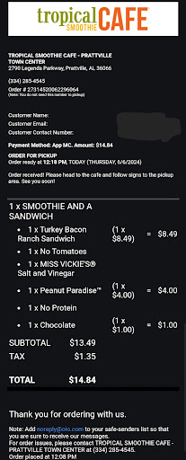 June 6th, I placed an order at 12:08PM that indicated it would be ready for pickup at 12:18PM. Arrived at 12:24PM and the smoothie was prepared, still waiting for the sandwich and chips. After waiting an additional 10 minutes, and seeing people that ordered after my arrival receiving their food, I went to the counter and asked if the ticket that was previously under my smoothie was being prepared. Response was, "We don't have turkey" and then she went back to preparing other customers' meals. Cashier wasn't interested in helping either. Waited another 20-30 seconds to confirm nobody cared about trying to fulfill my order with an alternative option and then walked out with just the smoothie. Had a meeting starting at 1:00PM and could not waste any more time trying to receive compensation or food. I've already submitted this to Tropical Smoothie online and called the 1-800 number so no need to waste your time suggesting that. Franchise owner obviously is not interested in trying to maintain a quality business with customer service.