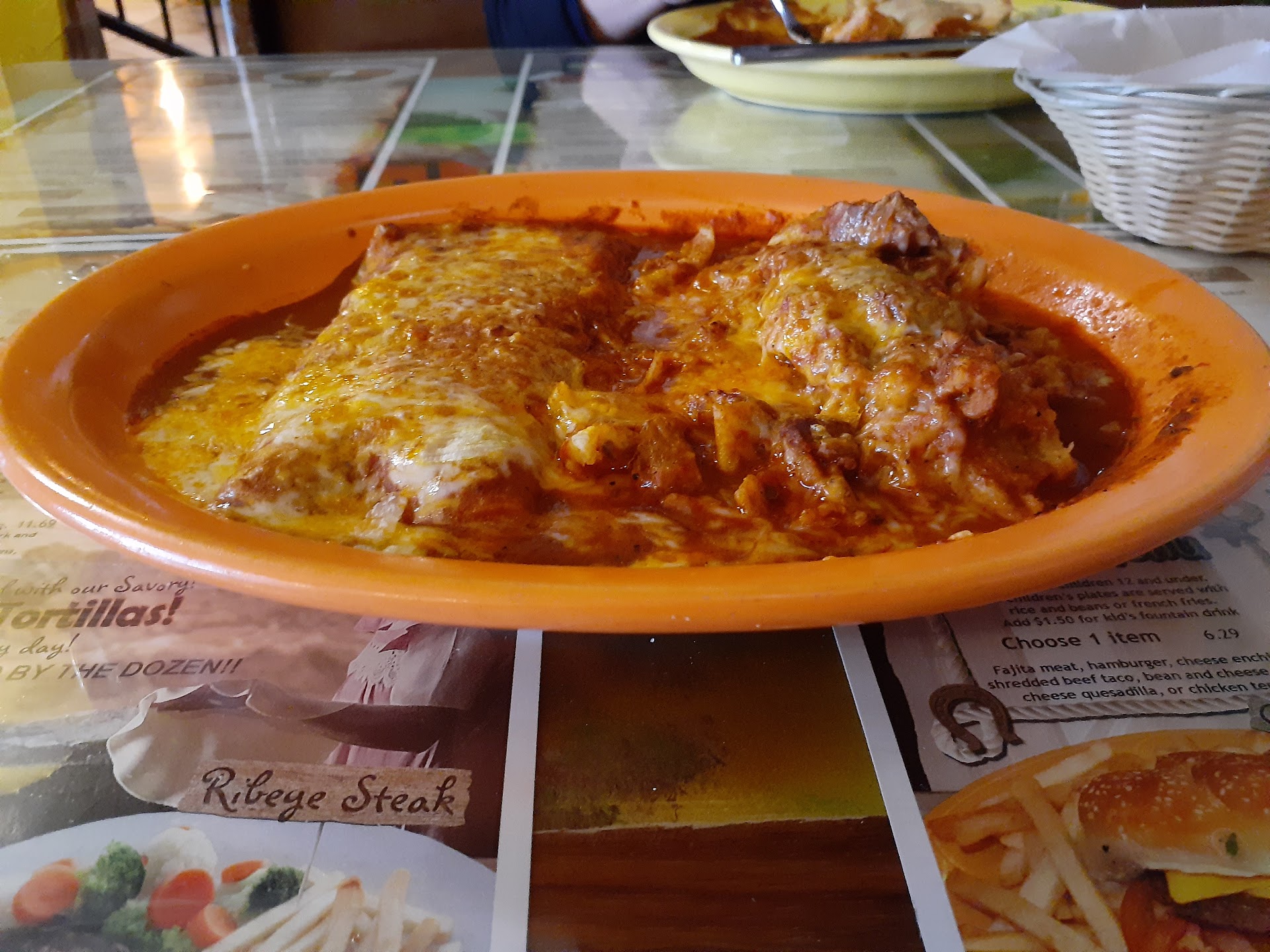 The burrito was enchilada style. Only took a few bites before getting a box but brought it back to hotel to eat later. I wouldn't have done that unless it was tasty enough to do so.