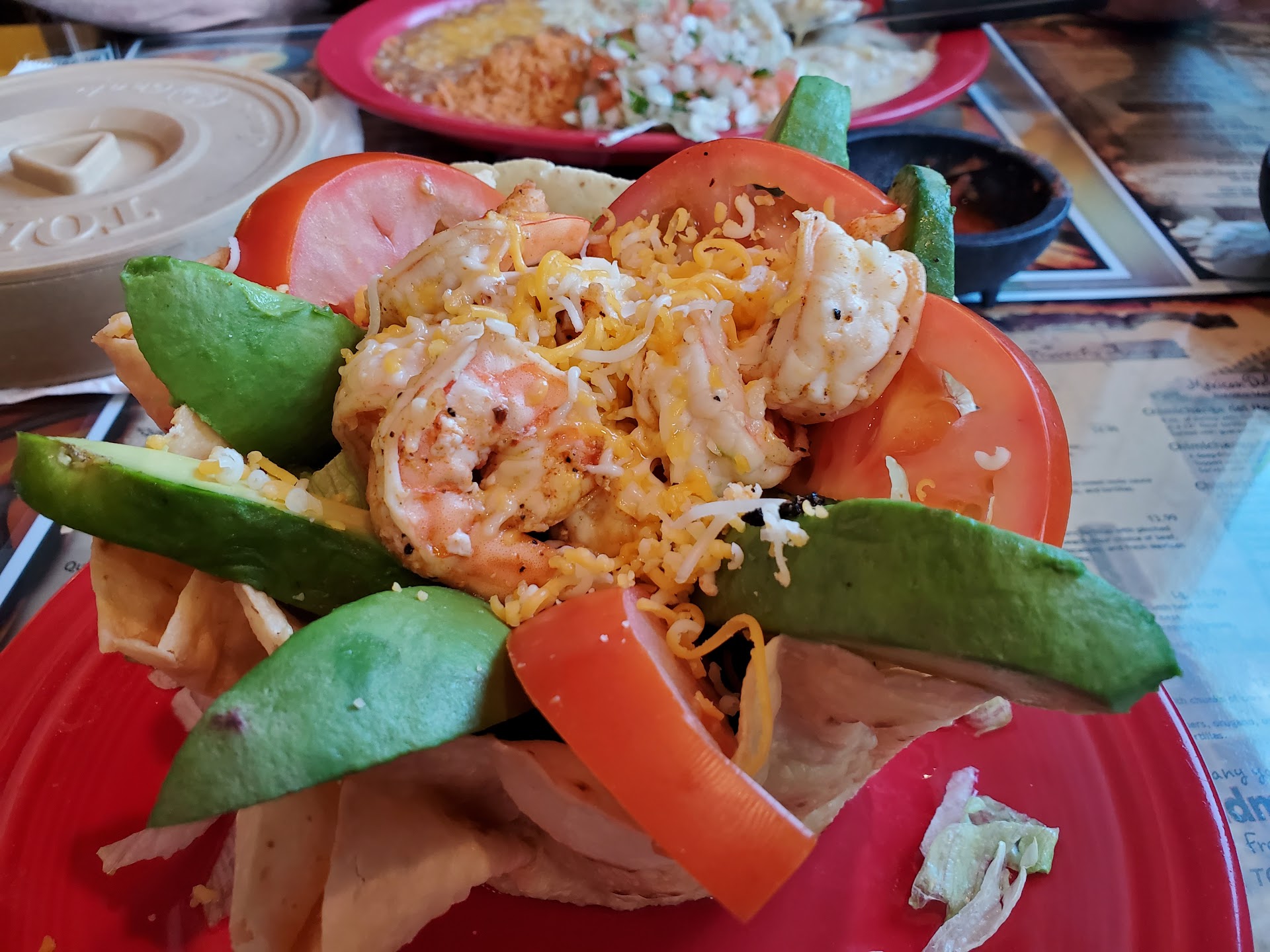 Now for the food. When I visit a Mexican restaurant for the first time, I often order a shredded beef taco, cheese enchilada, and chili relleno with refried bean and rice. This gives me a good idea of how well they know how to season their food. If they canāt get these simple things right, they wonāt be able to get other more complicated dishes right either. The red sauce on the enchilada was rich and savory. They nailed it. The beef in the shredded beef taco was well-seasoned, and the shell was nice and crunchy, with a solid texture. The relleno batter was light and fluffy with a savory and rich green chili sauce. I would have preferred a bit more spicy heat, but it was still amazingly flavorful. The refried beans were perfect, as was the Spanish rice. My wife ordered the shrimp fajitas, which came to the table sizzling hot on a cast iron griddle on a wooden platter, with her rice and bean on a separate plate. She was surprised at the number of shrimp in the order. She raved at the flavor of the food and how the shrimp was not over-cooked (as it often can be).