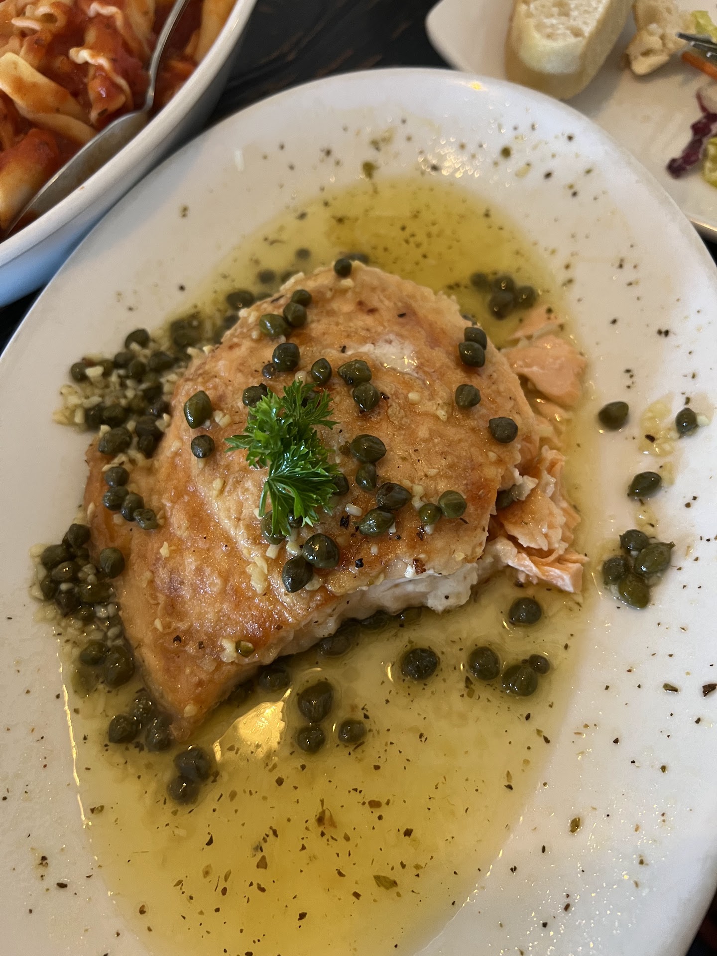 The menu featured simple Italian dishes that were easy to prepare, with nothing extravagant and a rather limited wine selection. One would typically expect a more comprehensive wine list at an Italian restaurant. The two small pieces of bread that were brought out were very good. The salad was excessively large, far more than what two people could finish — possibly enough for four — which seemed wasteful. There were just two of us.