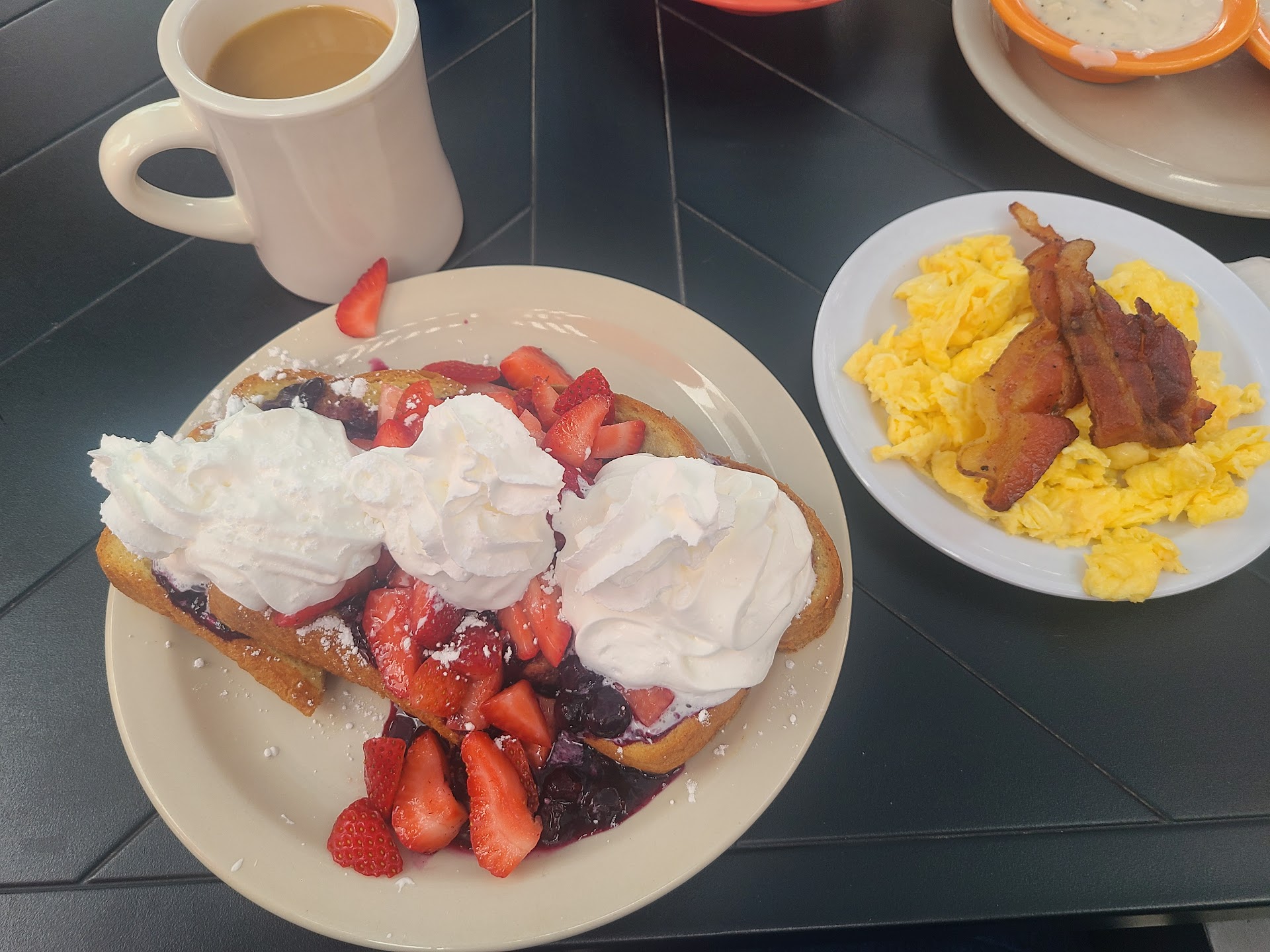 Service was spotty. We kept having to ask for coffee refills. I got the blue tsunami and I wanted my pancakes more well done! They didn't do that, so they took them back and the server never brought them back to the table again, until I had to ask. By then, I done eating. The bacon looked like it was pre-cooked and then reheated in a microwave. Nothing looked fresh.