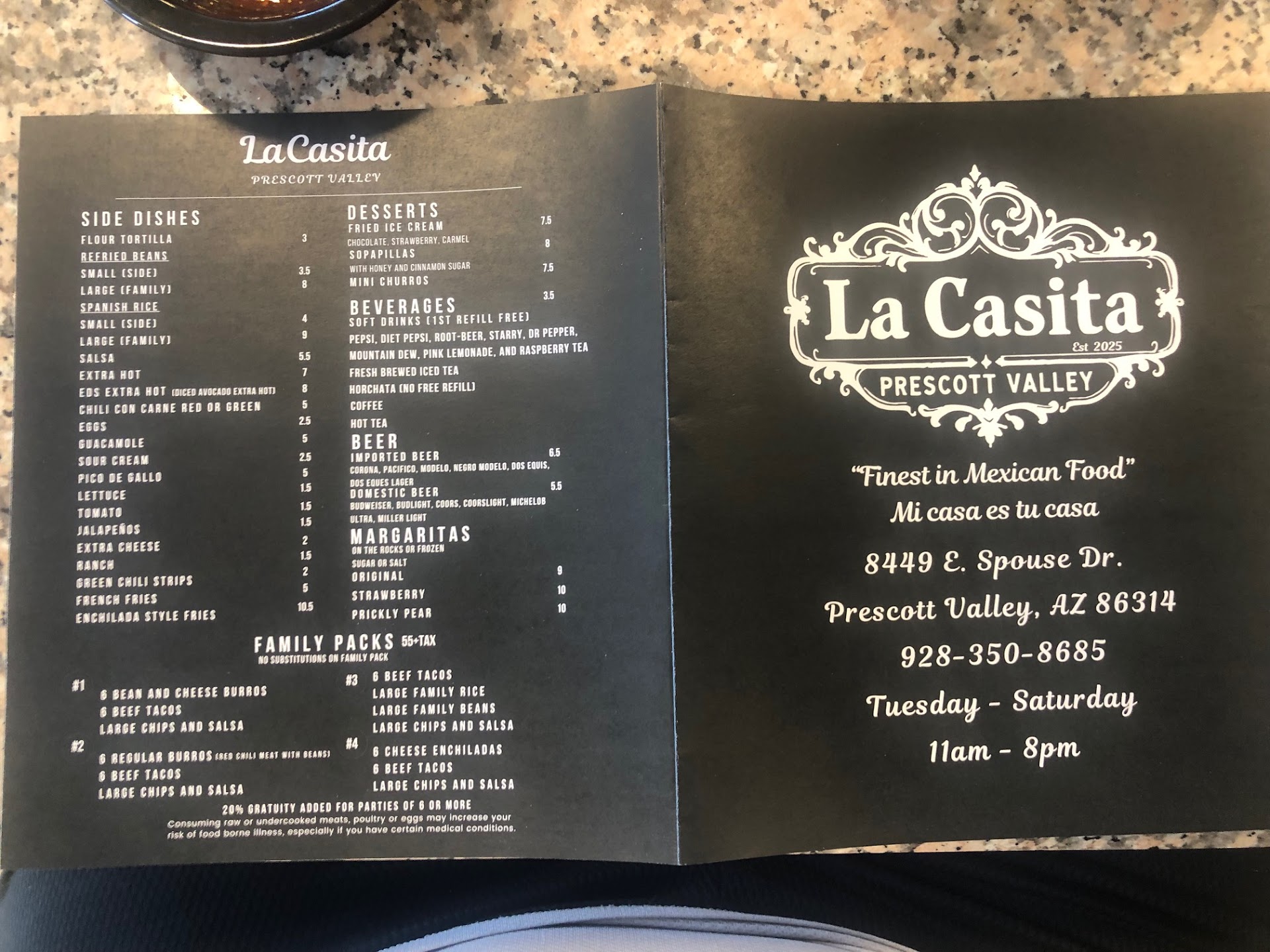 Went in for lunch in early June to check out this new Mexican restaurant in PV. The service was excellent, very attentive. I always start to grade a Mexican food place by their chips & salsa; these were very good (I like thick salsa). They deliver the salsa in a mini carafe, to pour into small bowls for dipping chips. It was also handy to pour salsa on my tacos! The Menu is extensive; lots of choices like Navajo Tacos and tostadas, many combo plates, fajita choices, ala carte items and salads. I had the 3-taco plate and was pleased to learn they only use shredded beef (never ground beef) in all their beef items. Overall, it was an excellent dining experience, and at reasonable prices (see menu pics).