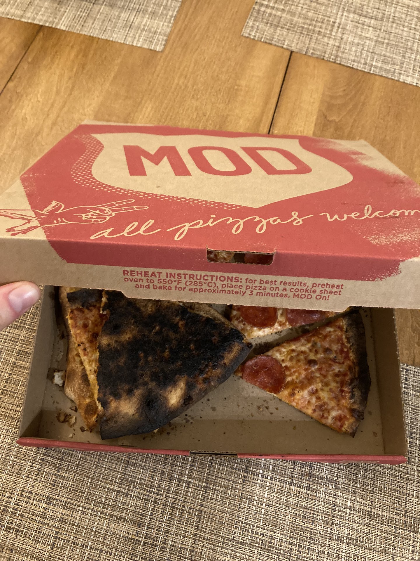 Read morePizza were wrong and under cooked also ice cold upon arrival! Pizza was gathered by door Dasher and it took 55 mins to arrive. I called Mod and spoke to two kids!! One being the manager. I was told in the most immature and ride way ,We don't do refunds or redelivery. Never once apologized or asked how he could correct this problem!! 2 pizzas small thick crust pizzas, one cheese and one pepperoni two snack cakes for the kids dessert not a hard order $62 w a $5 tip!! Just wow!!! In this economy it must be nice to anger and turn your loyal weekly customers away with no resolve and laughter!!! $62 buys 2 large pizzas from any other place in n town!! Also guilt by association and to Door Dasher travel around with orders for hr with no warmer bags even. Also maybe retraining your so called managers with better customer service and a better policy on reorder or refunds. Mods employees arent in a fast times movie when inter acting...
