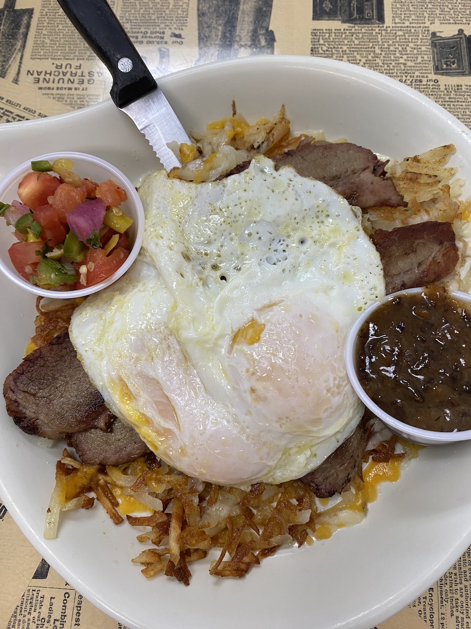 I tried the Friday Fish Fry on my first visit. The cod fish used a heavy thick batter, which was heavy for my liking, but the shrimp was excellent. They offered three sides besides the fish! The offering was so large; I wound up taking the fries and some of the onion rings home for a late-night snack. On our first visit, my wife ordered their Southwest Brisket Skillet, claiming it was almost as moist as the brisket I make. Which is quite a compliment. For breakfast this morning, I tried their Chorizo Omelet. The omelet came with hash browns and sourdough toast. Despite its size and deliciousness, I managed to finish the meal. I WILL order this again. The chorizo had a nice kick to it. If anyone leaves Sally Bâs hungry, itâs their own fault.