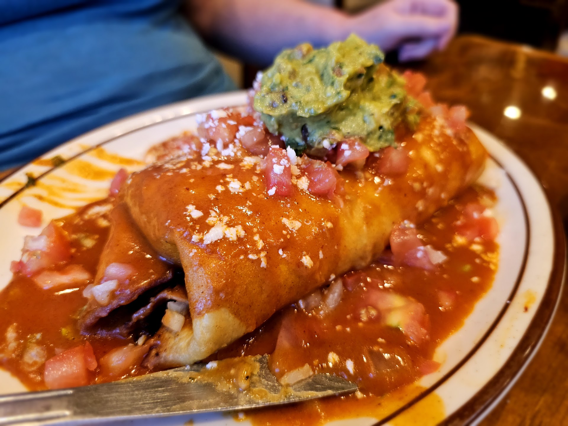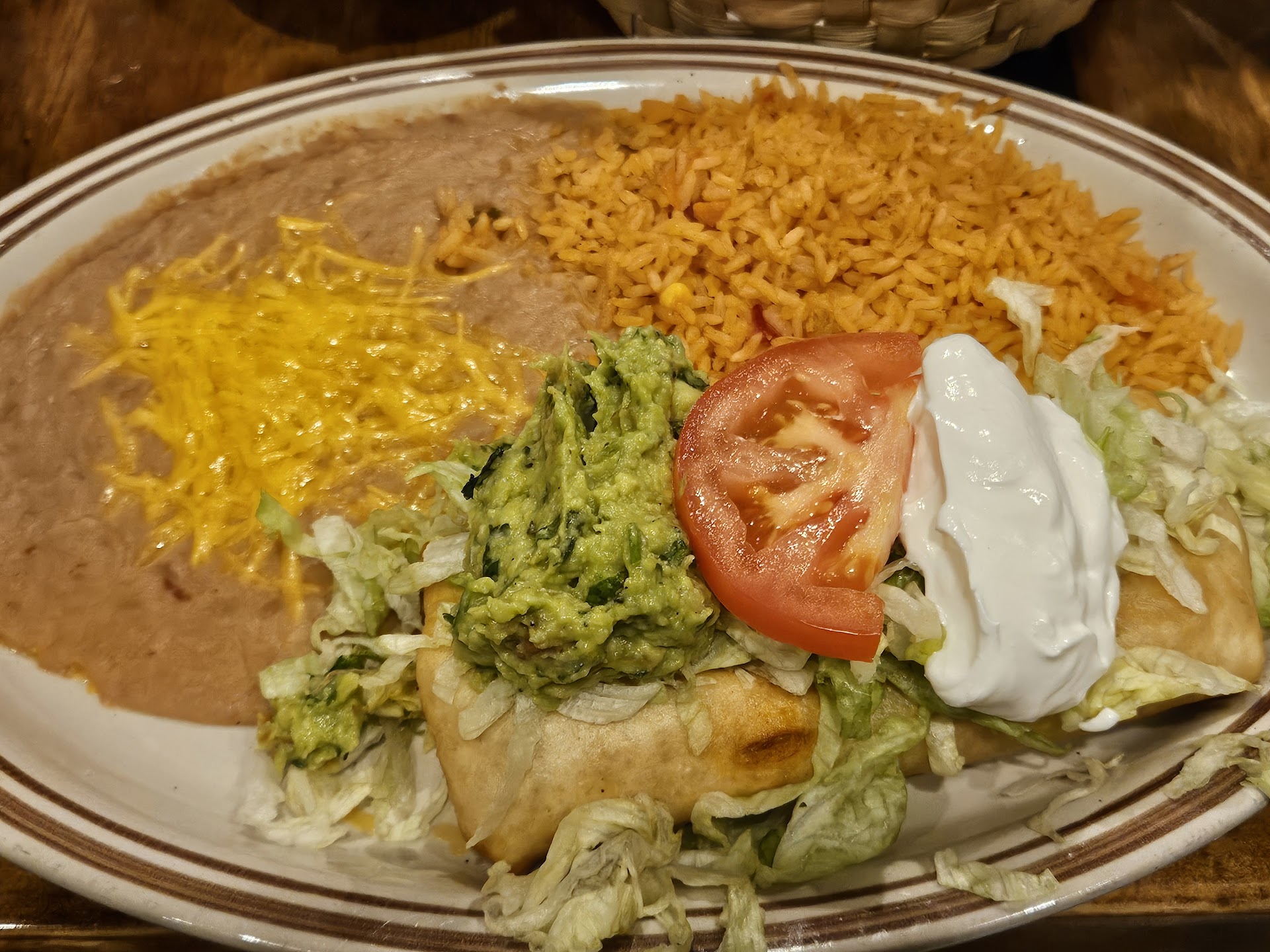 I ordered a shredded beef Chimichanga, and my son ordered a burrito entree. The portions were very large, and we didn't leave hungry. Both items were high quality and nicely seasoned. The shredded beef was delicious without adding salsa, and the guacamole was fresh and flavorful. The beans and rice were good, and the portions filled the large plates.