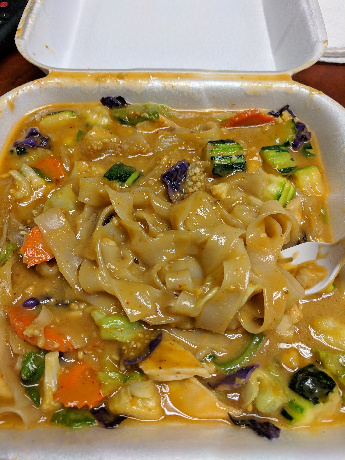 The soupy, oddly flavored dishes donāt share the consistency, spices, or many of the ingredients of most Thai food I have eaten (and Iāve had Thai food from all around the U.S. for some 40 years now). I suspect these dishes are a very specific creation to Thaifoon. And when I order Pad Thai with shrimp from a to-go place that costs $18, I expect more than a half cup of wide egg noodles, five shrimp, a cup of cabbage, and some baby corn floating in an endless sea of soupy sauce. This wasnāt anything close to any Pad Thai Iāve ever eaten, and the flavors fell short of an enjoyable alternative. My wifeās yellow curry dish was similarly sparse on meat, and mostly a lot of rice and vegetables afloat in an endless curry soup.