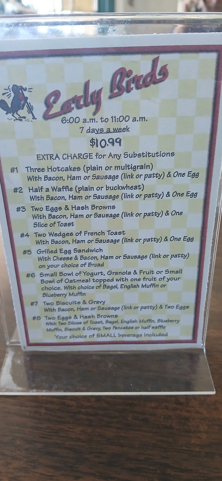 We were a big party with a dog, which they offered outside seating to accommodate at 2 person tables, so we had to split up. Not that big of a deal, but we had 2 babies with us and I had to get our highchairs after waiting 5 minutes for them (the 4 other kids were able to go to the bathroom and come back). The food was disappointing. When we were asked about drinks we said water to start for everyone and coffee for the 3 adults. The coffee was disappointing, very watered down, in tiny mugs. The kids ordered chocolate pancakes, which were described in the menu as having the chocolate chips cooked inside, but when they arrived they were just plain pancakes with a couple handfuls of chocolate chips thrown on top. One of the kids didn't like sausage, and asked for bacon instead, and it was as if she asked for something crazy and it was not an option to replace bacon for the sausage. And between 3 kids and 2 adults that ordered pancakes or waffles we were given 3 small plastic cups with syrup. The child wanted more bacon and was then brought a plate of like 10 pieces of bacon. The service was really slow for how few tables were filled. It was so slow that another table was able to get up and walk out without paying and were long gone before it was noticed. They only accept cash and have an ATM inside to get cash from for a small fee, but I'm not sure they advertise this. When asked about this they said, "we've been in business for 30 years and never accepted anything but cash." I wouldn't recommend this place. It was clean, did what they could to accommodate our group, but from the disappointing food to the slow service I can't give it any more...