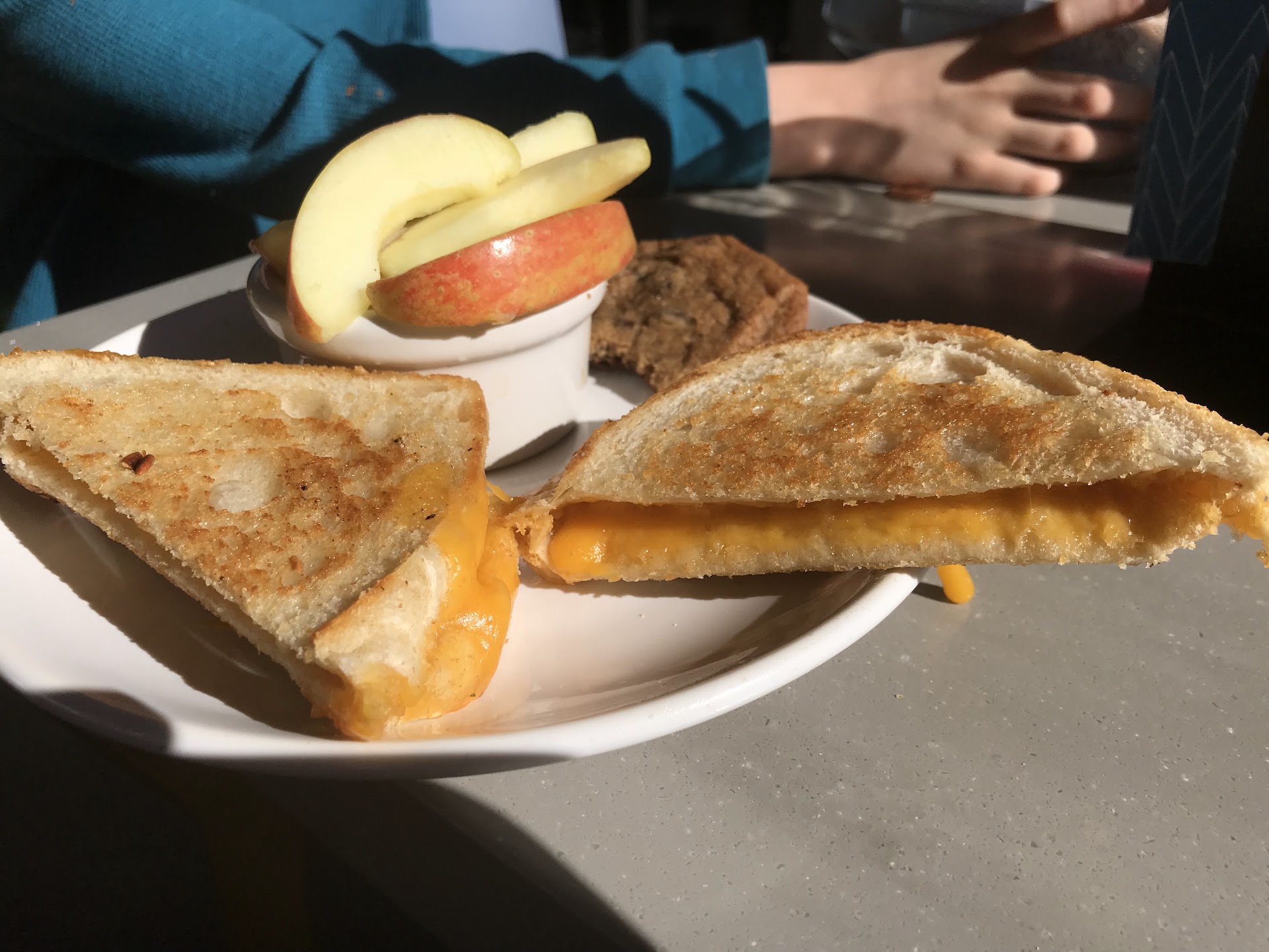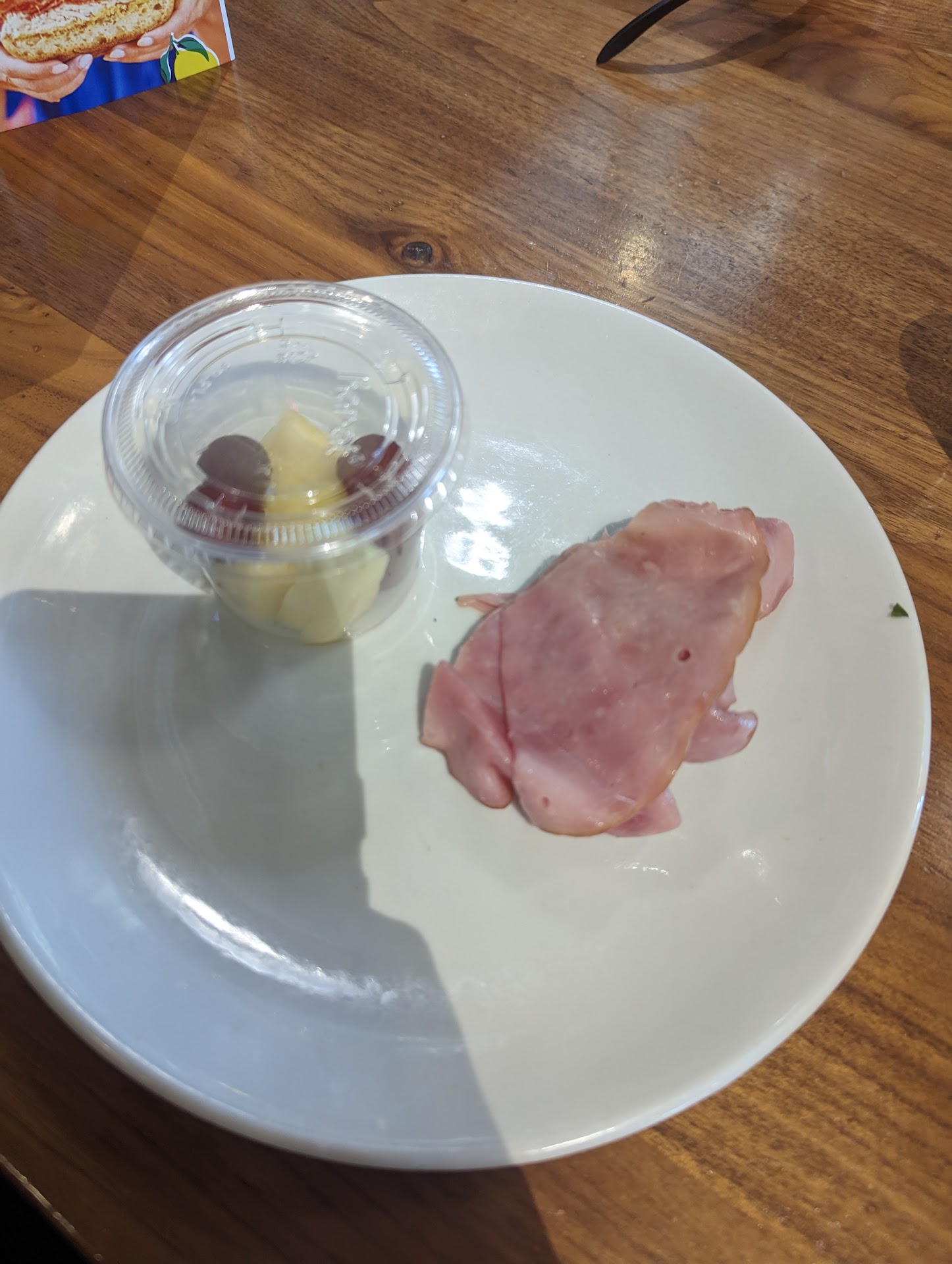 Food came after 30 minutes and the kids meal came with none other than A FRUIT CUP. A measly one that was only half full but they have fruit cups and refused to sell me one. Bizarre. And there was a chocolate chip cookie on my daughter's plate as well (they obviously don't care about allergies) along with her lettuce wrapped ham. After I removed the offending items, it was a very sad looking $6 plate of food. But she was happy and ate what was available to her.