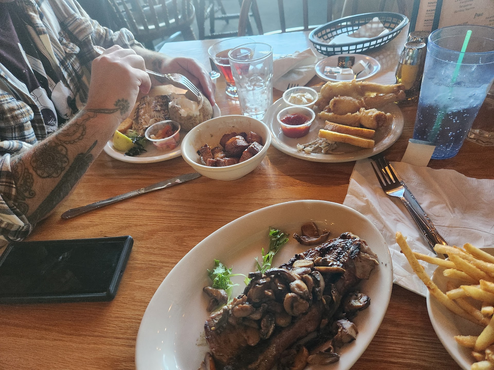 Read moreWent hoping for good steaks and frog legs, but unfortunately, found neither. While both options were available, they were also severely lacking. The pace of the meal was pretty bad. We had our appetizers for less than 5 minutes before the main food came out. My spouse's Manhattan whiskey came out in a chipped glass after the bread, but before the appetizers. We ordered the Mahi Mahi, which was way overdone and dry. Tasted like canned tuna would have had better flavor. The steak, a New york strip, while certainly thicker than standard, was not trimmed appropriately. I had to cut grissel off myself. When ordered rare, the steak came out more around medium. The char wasn't that great either, mushrooms for the steak didn't really taste grilled more like if you opened a can and plopped them on top. The potato sides were odd as well. We got the au gratin potatoes, a traditionally layered cheesy buttery potato baked dish. Here what they served in a ramekin was more what you'd find along the lines of grandmas shredded potato hotdish. We also got the baked potato and the fries. Both were normal if a little bland. The frog legs, which I was hopeful for given their price, tasted a lot like from frozen. The batter was too thick as well, leaving me with a batter casing and a naked leg, which was very bland even with cocktail sauce, which was an odd choice in and of itself. All the food desperately needed better seasoning. Even some salt and pepper would have been better than whatever they had going on. The pork belly bites were the best part, but they shouldn't have pieces that are all fat. Whoever is in charge of trimming was not on their A game. Probably won't go again. Decor wise was very hunting lodge styled. With their view opportunity and the right lighting could feel...