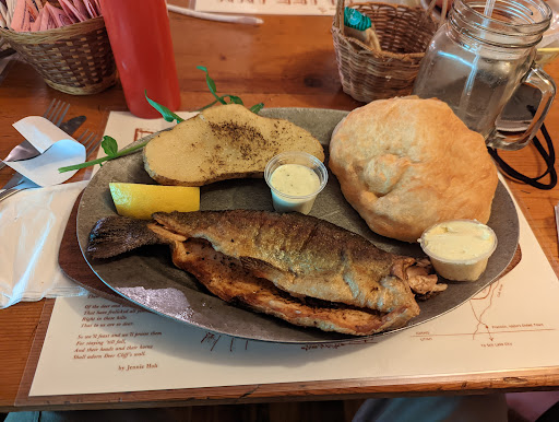 The fun came with the locale, history and serving plates. The crockery was old fashioned, if not outright old. Not but old in a bad way. This place reminded me of my grandparents home. Crockery plates and atmosphere thick with memories. The fish was served on a old fashion oval iron plate. The canyon, trees and rushing river was hypnotic and relaxing. The budding flower bush on the back deck smelled heavenly.