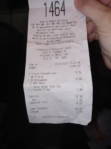 This McDonald's is the slowest fast food place ever!! They have 2 drive up lanes (they can't handle 2 lanes) we pulled up one car in front of us, two cars ahead of us waiting, 2 cars at other drive up lane. Girl asks us to wait, we say ok. 10 minutes it takes her to get back to us , she took the orders from both other cars before ours. She keeps asking us what our order is kept getting it wrong. I suggest you just let people pull up to the window and take their order. Finally, we pull around the corner and to our surprise, one car is at the pay window paying. No other cars in the line. So we pull up and she takes our payment and she acted very confused. So we pull up and wait some more. The car in front of us only got a drink and a small bag. So, what's the hold up. Oh, did I tell you all of the soda machines were down, only had sweet tea and bottled water. We pull up get our stuff, check it it was right. All total we were in line 20 minutes 8:30 pm. We get home, no ice in our warm drinks the tea is so sweet you can't even drink it. They have a now hiring sign outside, but they don't call anyone back who fills out application or even goes there. I don't know who owns this store, but you need to do some secret shopper visits on this place! I will say the people are very nice when you go inside. Please help them hire some people. I love to see managers succeed. So I'm praying for this team at this store! My local...