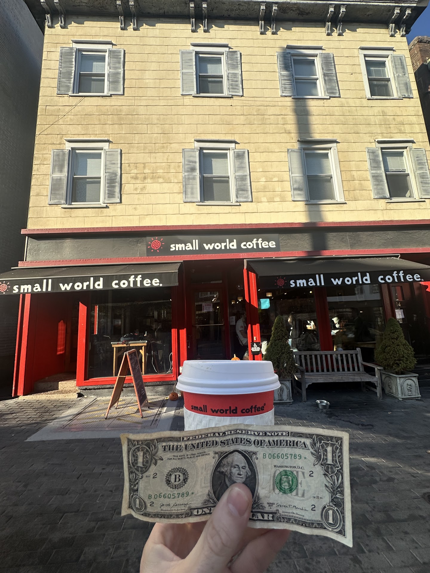 You oft see the line from Small World overflowing out of the cafe and out into the street. It appears splattered over the sidewalk like a latte spilled by someone still tucked away beneath the haze of morning grog. This line is as much a testament to the worthiness of the establishment as it is an indicator of insufficient queuing area. That is to say: it's pretty good but also could benefit from more queuing area. I come here 5 days a week at least and the staff play along that they don't recognize me or know vaguely what I'm about to order. It's an intoxicating relationship. It's a coffee shop with staff that doesn't outwardly judge you.. what more could one reasonably ask for? Today, my cashier replaced this star dollar from the tip jar with a dollar of his own. I think this is an accurate summation of the SW experience as a whole: they equip you to face the day whether it be with a coffee in your hand or, perhaps, a dollar in...