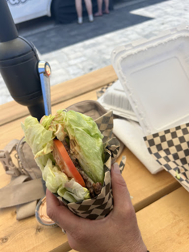 Stopped by today for lunch - man! Yum yum. Great portion sizes. Depending on your appetite, you could easily split a burger+fry. Fries had a similar feeling to five guys, but not as greasy. Onion rings, thick and definitely hand-battered in the truck & delicious. Super friendly service. Wait time is expected with made to order - all fresh!! Burger was great as well. Lots of flavor throughout. Prices are that of quality product, service and convenience - not crazy high but up there. Kind of sucks that there is no seating nearby to avoid condensation in the containers in the travel home.