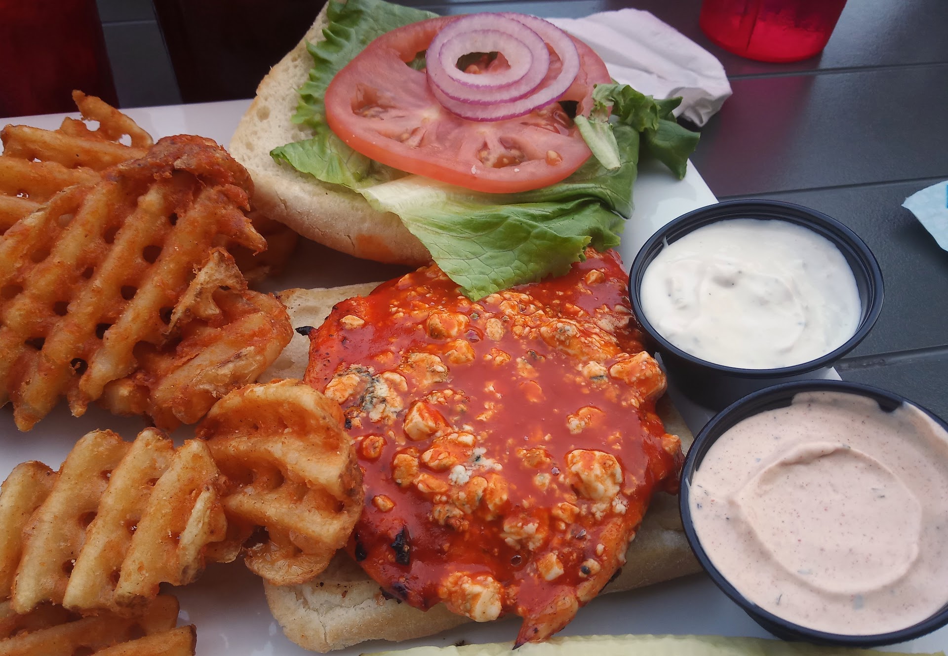 My daughter and I ordered the Grilled Chicken Breast Buffalo Blue Cheese sandwich. It was nicely prepared on a Ciabatta Bun. We agreed that the chicken was a little over cooked but was still tender however the bun was a bit too big for the size of the breast meat. I also ordered a side of waffle fries with seasoned sour cream ...very tasty & addicting with everyone.