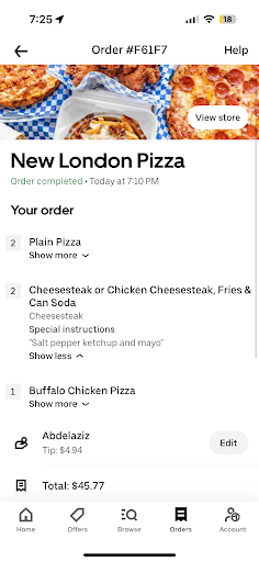 They have several buy one get one offers listed on Uber Eats. Buy two plain pizzas get one free, and buy a cheesesteak or a chicken cheesesteak platter (fries and soda included) get one free. This was the whole purpose for why I was willing to give this new place a shot as my family was split on pizza or cheesesteaks for dinner and here was the solution. When my driver arrived I was told that someone at the restaurant said it was only one cheesesteak platter and not two even though he showed the order and even the platter had issues as I asked for salt, pepper, ketchup and mayo on it, but I got steak and cheese.. that was all! The driver said they even took the extra soda (included in the platter) from him.