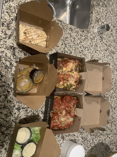 My teenage son isn't a big Detroit style pizza fan and we were happy to hear that he could order a slimmer style pizza. Like Detroit style but about half the thickness and he loved it. He had the Slender Submarine pizza.