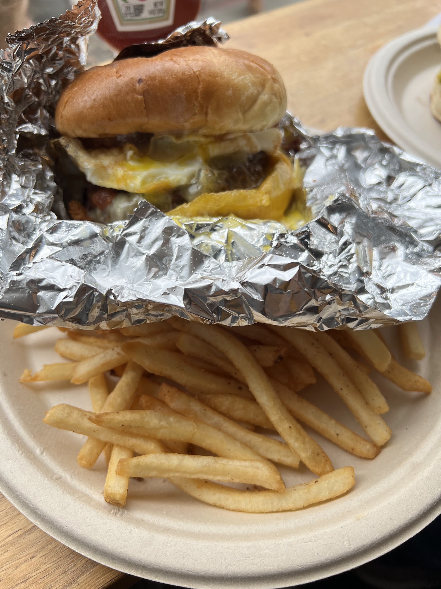 Orders being consumed on site should be served on paper plates, not in bulky take out boxes, which are hard to eat from, cost a lot, and increase the trash volume in the already overflowing trash cans…. A vicious circle!