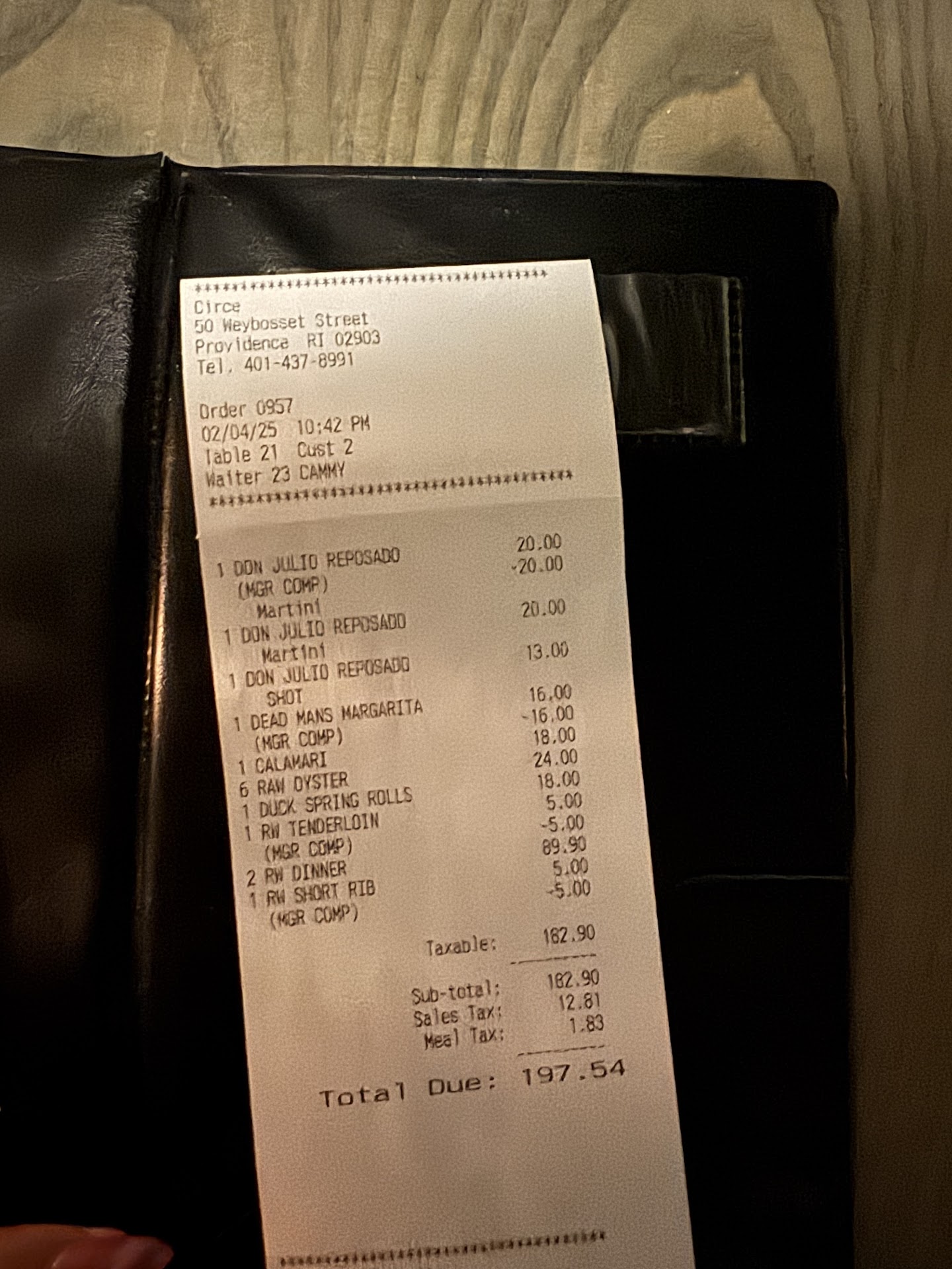 Read moreI want to preface this review by first saying that my boyfriend and I have been to Circe during restaurant week twice and loved the entire experience. Food, atmosphere, our server, etc. were all perfect. And that is why this review is high.