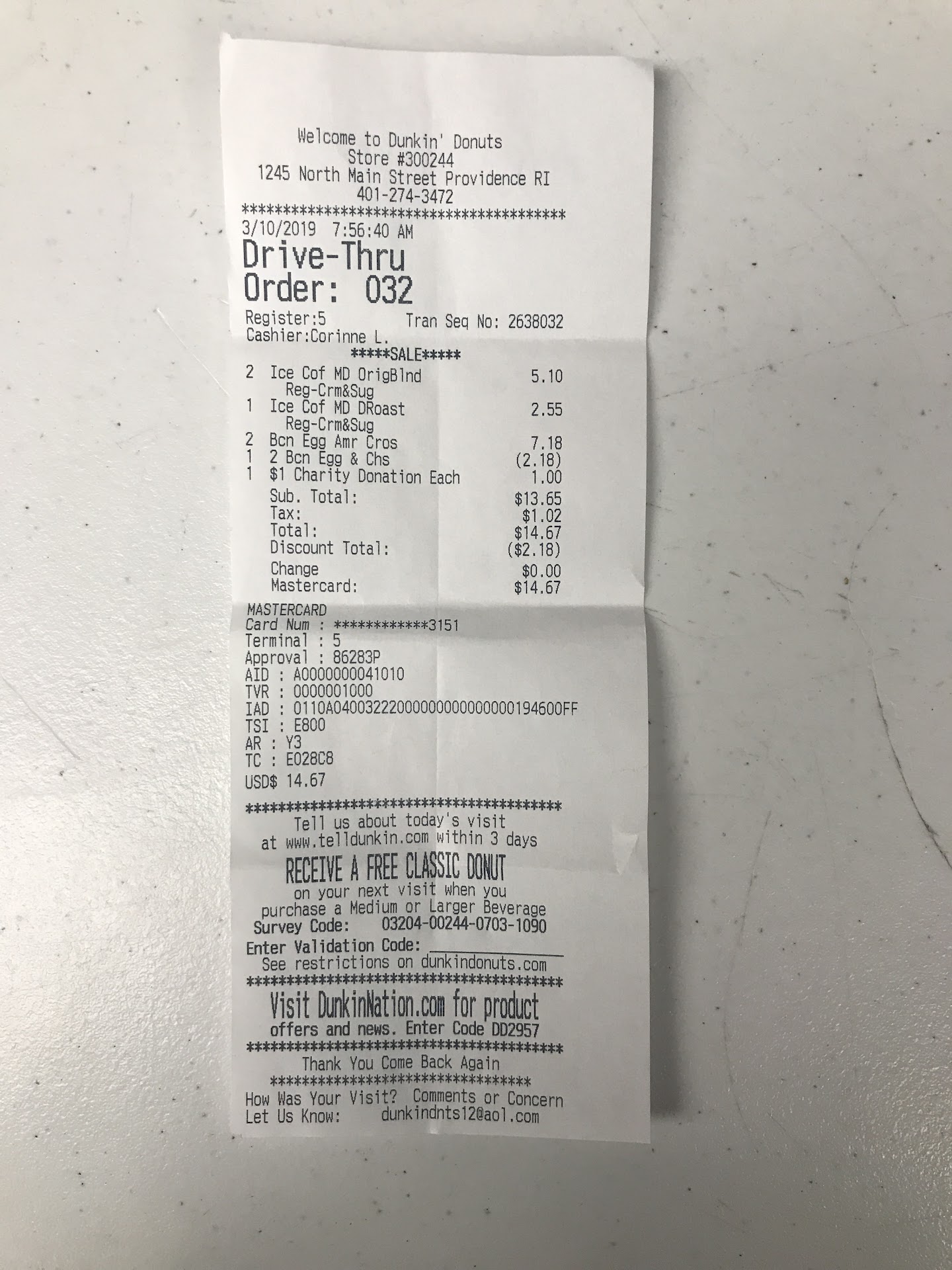 Used to be my favorite dunkin. Then one time when I needed my receipt, the employee dug through the trash and handed it to me. This time, I ordered two Dunkings. When I arrived I got two Dunkings in the wrong cup, with straws, no cold foam, and no cinnamon sugar. The employee said “dunkings are so popular right now that we ran out of cold foam and the cinnamon sugar” When I get home, realized I paid way more than what I should for what I got and didn’t even try it, I drove back to the Dunkin that was fortunately only down the street and told them about the issue. The employee was very unhappy and told me I wouldn’t be getting a refund or have my drinks remade unless I had brought my drinks back. Fortunately, I had both of them and gave them back. She did not seem happy. Her manager told me to drive around and gave me two fresh real Dunking drinks In the appropriate cups with the appropriate toppings. When I got home, I realized they had barely put any coffee in them. It was mostly water and cream. Boooooo. This place used to be “the...