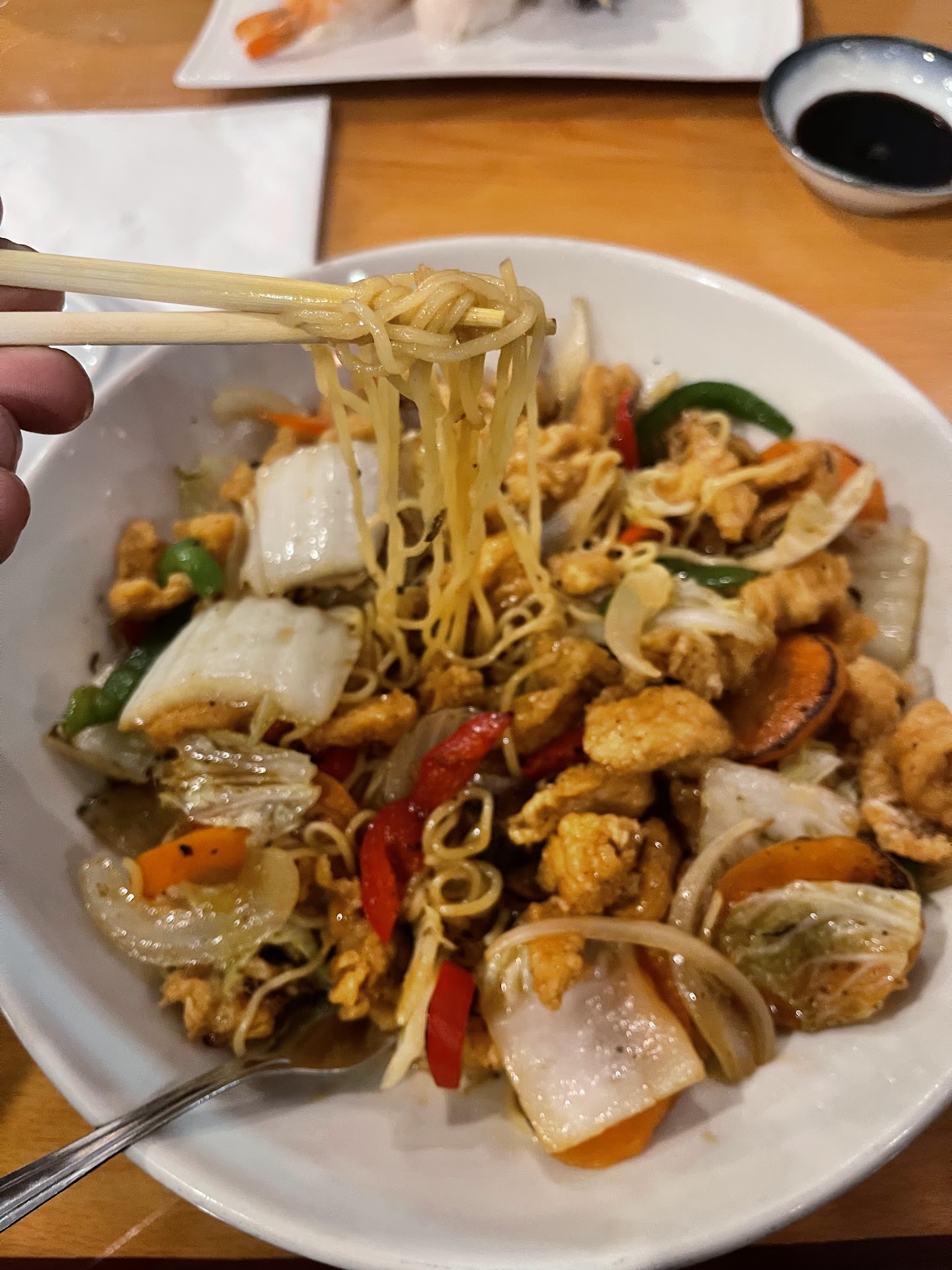 It took a while for the server to come to us, but that gave us plenty of time to decide. We ordered the steamed shrimp shumai, sushi regular, and chicken yakisoba. The shumai were a healthy size and were very good. Definitely my favorite part of the meal. The sushi was very basic, honestly I’ve had better sushi at market basket. The yakisoba was fine, but nothing spectacular. We did enjoy the miso soup and salad that came with them, but I have had better for less $.