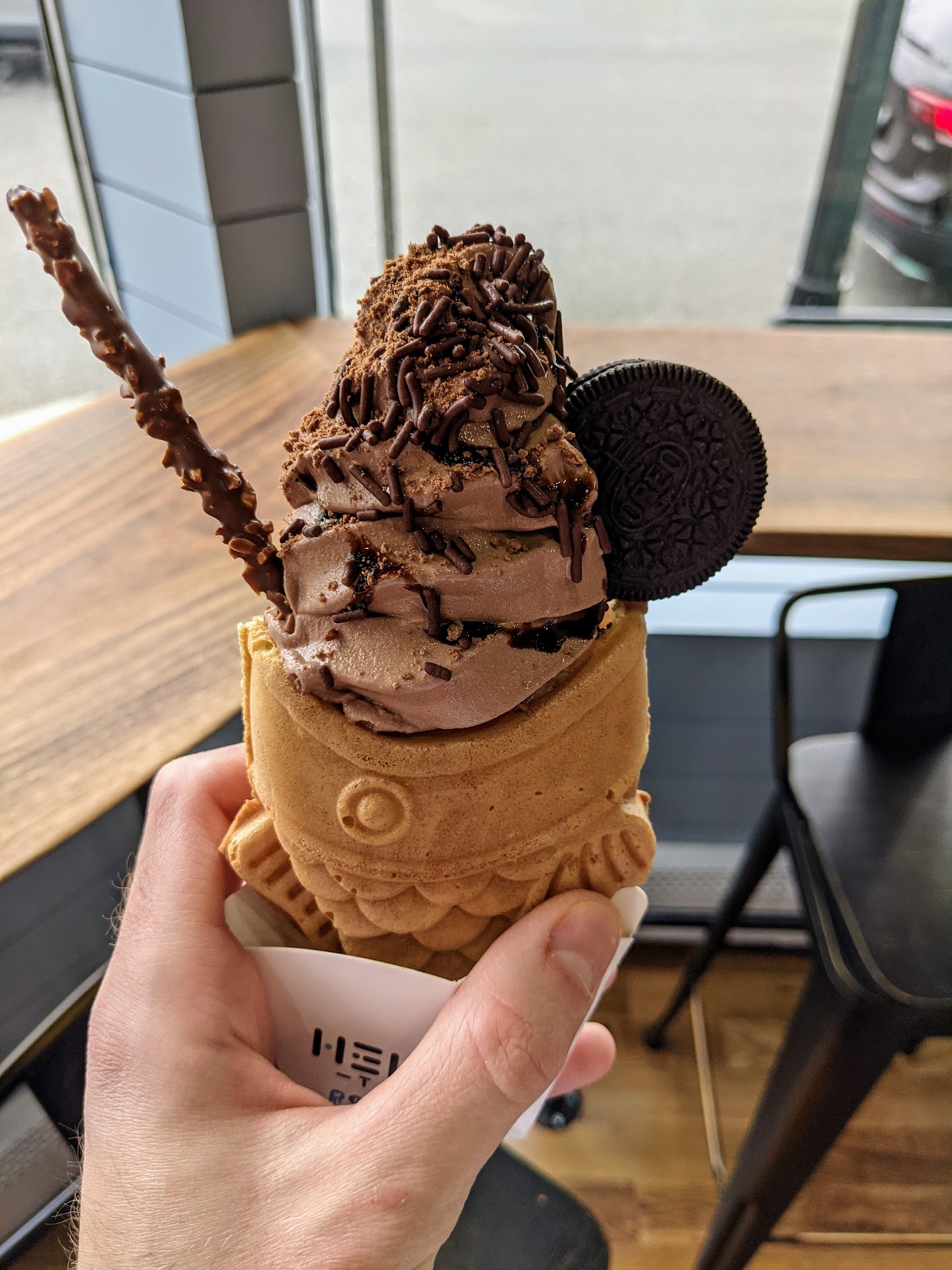 The ice cream itself is tasty, I got the Ube flavor with toppings, in a cup with a cone on top. I asked for a Nutella filled cone. There was a dime sized amount of Nutella in the tail of the cone. When I saw it on IG I thought there would be more? Also my boyfriend and I were literally order #1 and our cones weren’t fresh. I’m Very confused. But again, overall it was okay. But also loses a star.