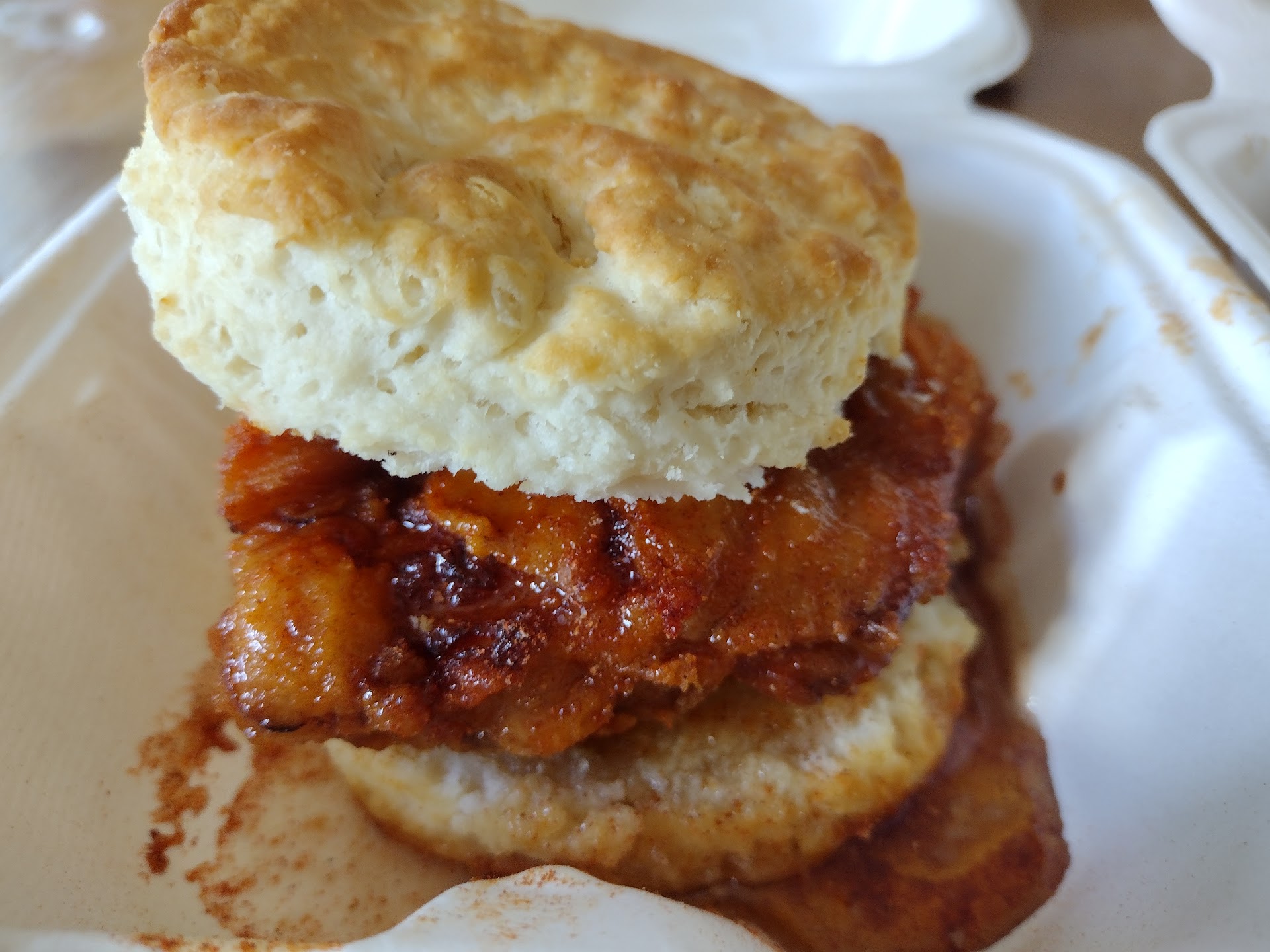 The Fried Chicken & Hot Honey biscuit was okay. The hot honey had a mild kick, and the chicken was similar to a home style chicken, but the sandwich needed more bolder flavors, maybe some cheese. I got tired of it halfway through—6 out of 10. The Country Ham, Cheddar & Jezebel sauce biscuit was sadly disappointing. The Jezebel sauce was overpowering with horseradish, and the ham was pretty dry. I'd rate it 4 out of 10.