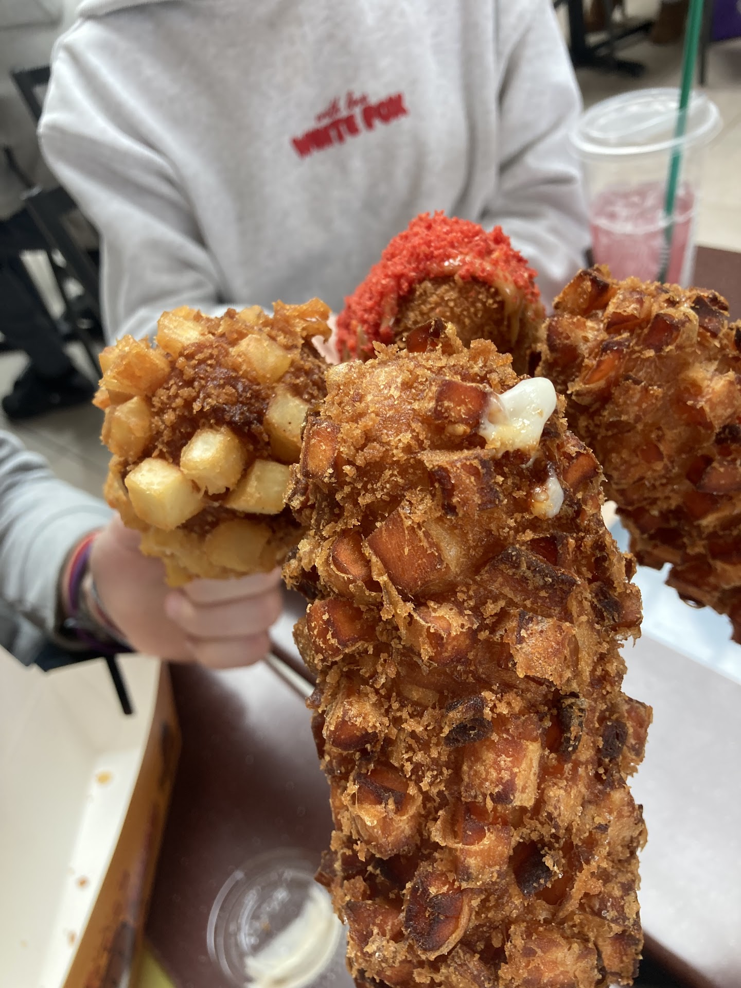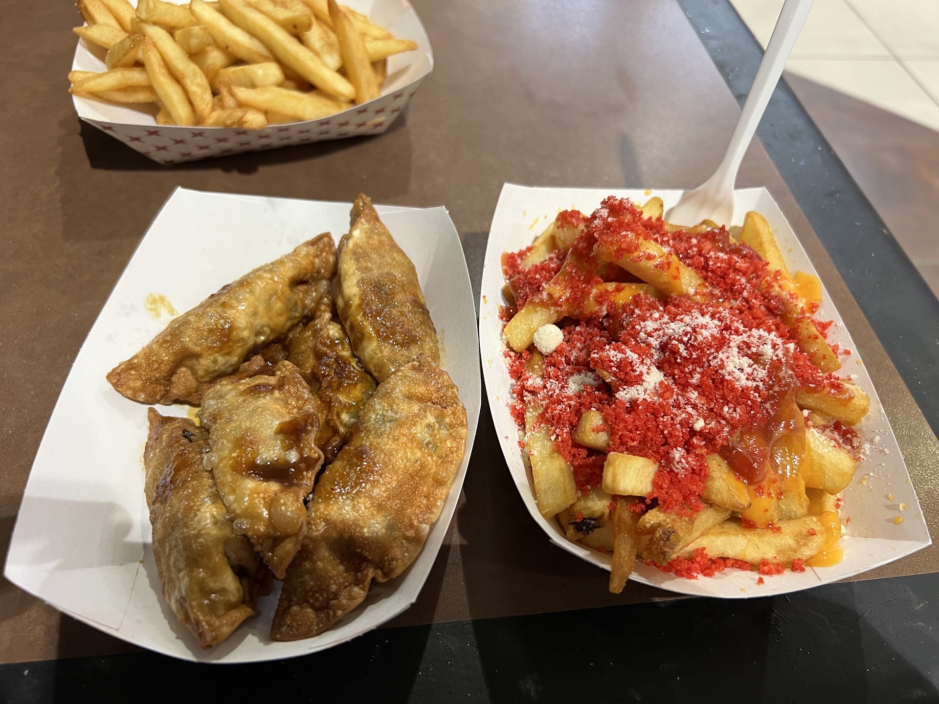 Decided to try this place. There was only 3 people working and there was about 20 people in front of me. I was in line for 45 minutes and then the cashier tells us there is no more dough left for the corn dogs. People were really upset! I decided to order some Kong fries and vegetable dumplings. The fries were pretty good even though it didn’t taste hot or spicy mayo flavor. The dumplings were like a vegetable purée filling. It wasn’t like fresh vegetables in the dumplings. The service was incredibly slow. They should have had 5-6 people working instead only 3 for everything. Then I’m sitting in the food court and I see the guy bringing in some more boxes of dough which they said they didn’t have any more. Took 1 1/2 hours to place and receive my order. This is no way to start a business! They gave me a free $2.99 lemonade because they ran out of dough.