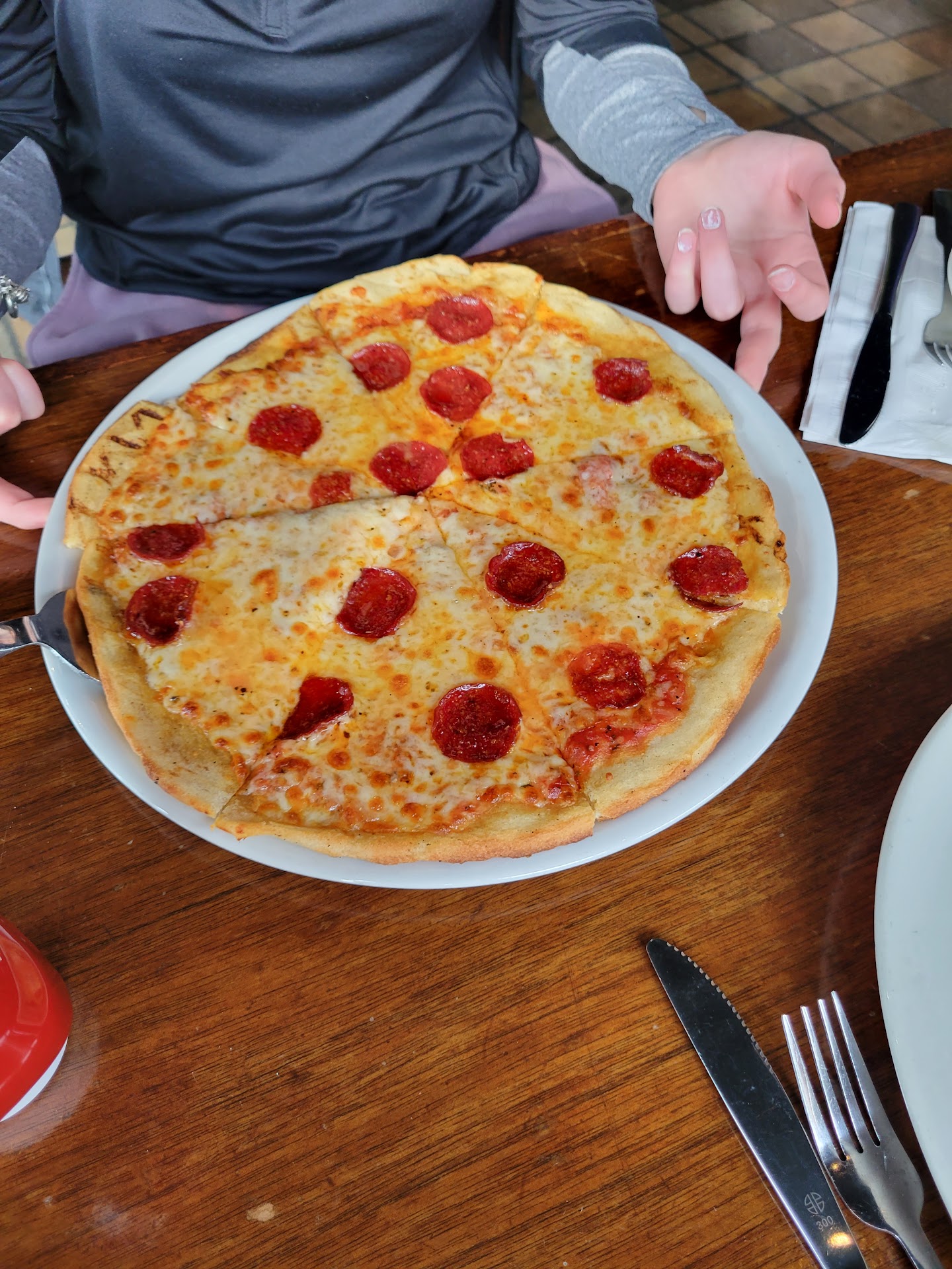 Pizza was about like cafeteria food, if you closed your eyes and were honest about what you tasted. Then the pricing structure on building your own personal pizza was pretty high. $13 for a personal cheese, and $3 for each "premium" topping. They count pepperoni as premium. So my daughter wanted to get a personal pepperoni and bacon pizza. I did the math at $19 and said no. So she got just pepperoni, and BOY was it skimpy. See the picture of this sorry looking thing. I had the chicken bacon and ranch. They left the chicken off by accident. They very kindly refunded the price of that pizza and made a new one. But you know how that goes....now everyone eats at different times.