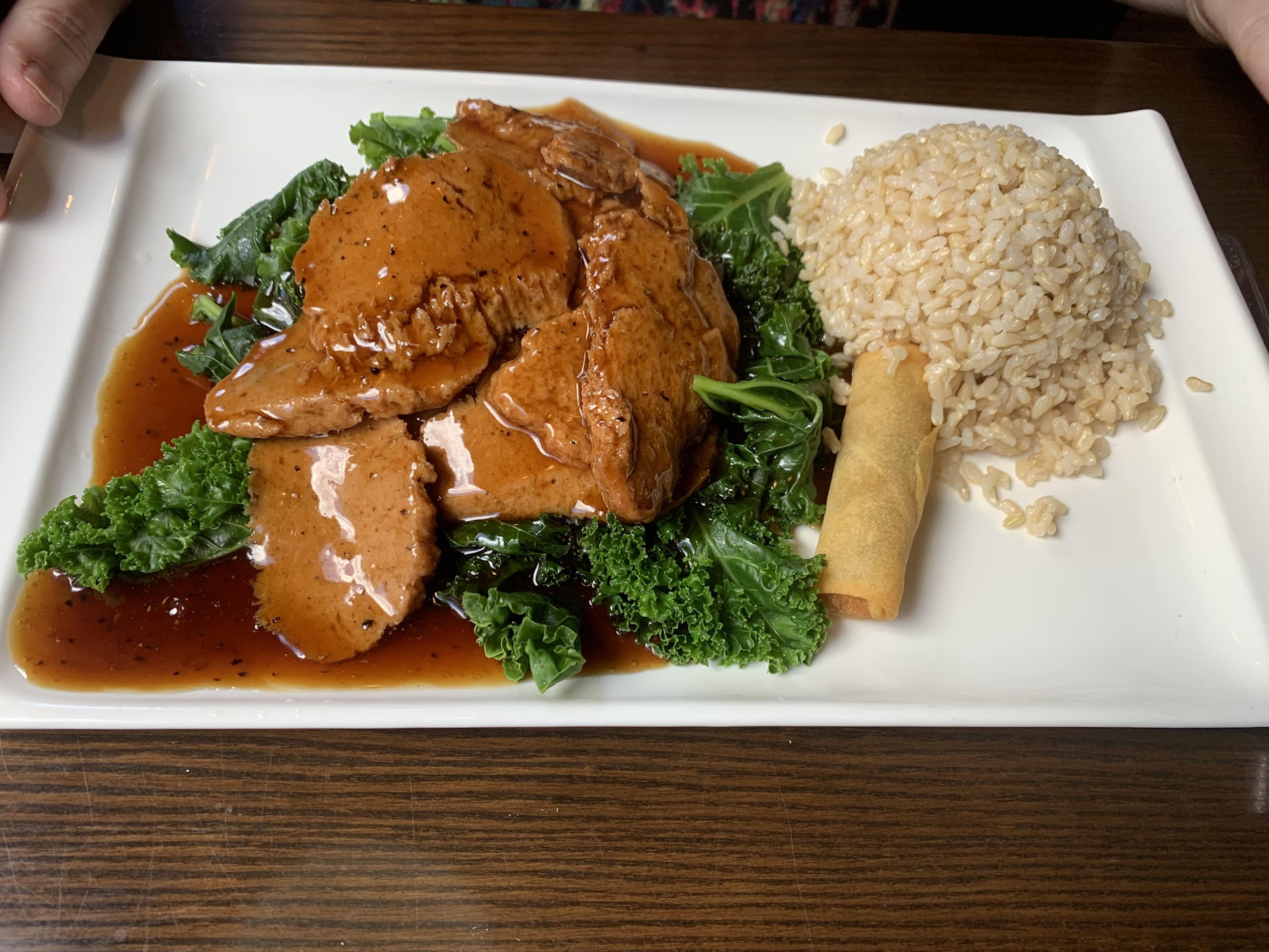 Black peppered Seitan: The texture was unlike anything I'd had before from Seitan, delectable. The sauce complimented the bed of perfectly boiled kale and Seitan very well. The spring roll was cooked perfectly, hot and fresh and the interior was delicious.