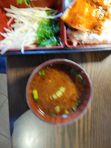 Similarly the Bok Choy was only 3 leaves along with some mixed greens lining around the outside of the bowl flipped portion of rice. There is sadly not even Bok Choy stem present within the dish. The dish is about 91% Rice, 3% Onion, 3% Whole Mixed Greens, 2% Edamame, 0.5% Finely Shaved, and 0.5% Nori. I would speculate with a squeeze of Yuzu.