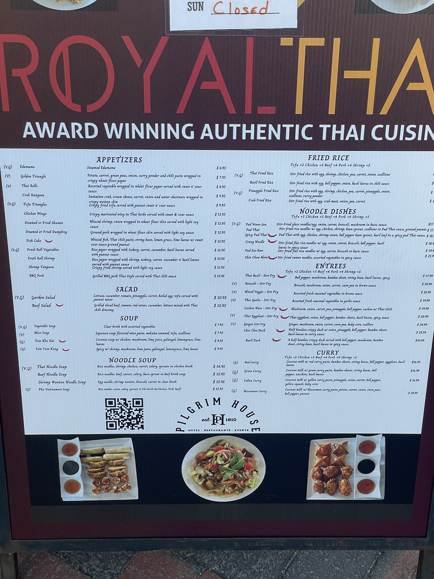 Read moreWhat a great first trip to Royal Thai at Pilgrim House. The ambiance is so warm and welcoming! The menu has a lot of options, and they aren’t kidding when they tell you 3-5 is spicy, so heed the warning. The Tom Kha soup really hit the spot, and the curry was massive! I do wish the rice came with it but that’s being knit-picky. I’m so thrilled they had Singha beer, and I will definitely be back to try more...