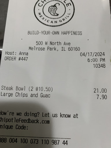 Iām so disappointed in this location and to have to make this bad review. Where do I start?. I work across the street and had been getting food from here for lunch for about 6 months now. I was thinking of lunch options today and almost ordered it but looked at my last order and remembered the 1 star rating I gave. Iāve added the pictures of the last few bowls for reference⦠If the employees arenāt going to honor the options given on the app for ordering, what is the point of being able to customize the order? EVERY TIME I order, itās the same order(as seen below).. extra everything (including paid double steak) and every time, they drop the ball. The lettuce you see pictured is all I was given. Doesnāt look like extra to me, what about you? Neither the cheese.. the list goes on. And donāt get me started on the meat portions that YOU PAY AN INCREASE IN PRICE ON AND AN ADDITIONAL CHARGE FOR THE EXTRA. They only consistently give extra rice, salsa, and sour cream. Itās frustrating because you pay all that money to get skimped! Make it right! Treat the orders like youād like yours to be treated. The order details are on the ticket, same as the sticker they label the container with. Yet, I feel like they do what they want each time. Pickup is supposed to be a quick option and same service, itās not that at all. The inside pickup is also disorganized. Unless you as the patronizing customer speaks up, the employees will ignore you. Nobody greets you. Nobody offers to help. I stand at the counter which is at the end of the checkout lane and right next to seating, so itās kind of in the way. In order to get consistent good food and proper portions, you have to go inside. I also donāt like being inside because this location is always terribly busy and not the cleanest. The tables are always messy. The floors are messy. Drink stations are always messy and limited in supply.. I have to go to the counter and inform them thereās no cups, lids, tabasco, etc.. and they give you a look before getting you what you need.. makes you not want to ask! I only came to review on Google in hopes Iād actually get some resolve because Iāve left several negative ratings after order pickup to no avail because Iāve never been contacted by anyone or compensated. Everything is high these days, not to mention chipotle announcing their decision to raise prices, so itās really frustrating to choose to spend your hard earned dollars...