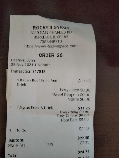 I was very disappointed after coming here for years, stopped in to pick up a beef and a gyro sandwich to go. Waited over 10 minutes, beef was cold and barely any meat on the sandwich, I could of counted the slices of beef(5) no taste! So disappointed! Didn't taste fresh, the gyro was ok slightly warm, not heated on the grill the pita bread slightly warm and hardly any taziki sauce.The service also was not welcoming. And another thing the prices really went up and they no longer have daily deals! I spent $24.75 for two sandwiches with fries and a drink. Next time I want a good Beef or Gyro I'll take the ride to Ridgeland and Roosevelt to Pete's hot dog stand in Berwyn! Too bad, Rocky's use to be good. By the way I wouldn't be complaining or writing this review if at least the food was good! We work hard for our money too, and if we choose your established the least we expect is a Thank you, come back again, have a nice day and good hot tasty food especially after...