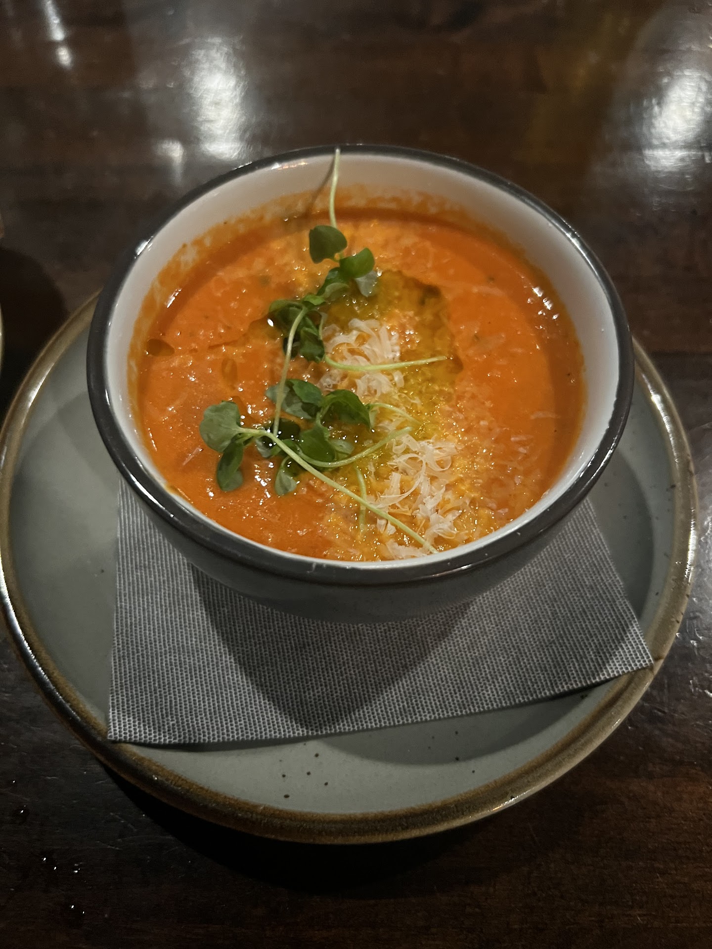 I ordered the tomato soup with an upsell for $4 of garlic bread - which I wasn’t aware of, however a restaurant of “this caliber” I wouldn’t expect to ask if I’m okay with an extra $4 so that’s no problem. Both the garlic bread & tomato soup were exquisite. Bread was slightly burnt in a few areas so more crunchy than preferred, but overall flavor was chef’s kiss