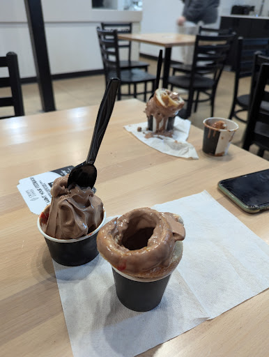 Read moreFirst time this week. The soft serve was really great! It's hard to find good soft serve. The cones were not what I was expecting (was expecting like a warm waffle cone and they're more like a baked roll with sugar dusting) - but they were great! It definitely was a lot of ice cream and a lot of cone - which is a good thing, but it was VERY filling. I've seen some other reviews about messy tables, etc - but it was very clean when we went. I also do like the wet wipes. And I like the 'our story' - great to read/see. A couple of comments for consideration - none of them really an issue. I don't love the self-service tablets for ordering, especially when a place is busy, because it's slower as everyone has to figure out what to add, how to add, etc. But it is what it is. That said, at the 'total' screen - it gives me the subtotal (two cones for $15.38); tax $1.12; and then two line-item fees - a $0.25 'convenience fee' and a $0.15 'restaurant tax' - it's not that the amount is a problem - it just feels kind of nickel/dime and was a distraction. I'd rather just have those fees baked into the price of the cone. Also, adding the toppings was fun - but the reality of the toppings is that you get 3-4 small strawberry slices kind of pushed onto the vertical cone; and a little bit of caramel swirl on the cone itself. A few issues: underwhelming amount of topping on the cone - but a lot of that is probably because it's hard to put toppings on a vertical soft-serve cone. Also, it takes a while to put on the toppings - especially the strawberries. And, as noted in other reviews, it's messy because you have the fruit falling on the table, you have the sauce dripping on hands & table. I love toppings, but feels like there might be other options. All-in-all, a great place and I'll be back - but you should definitely plan on a 'dessert meal' with the portion size. And it's not something that's easily shared - especially for the cone - you will have to kind of wrestle with it to make...