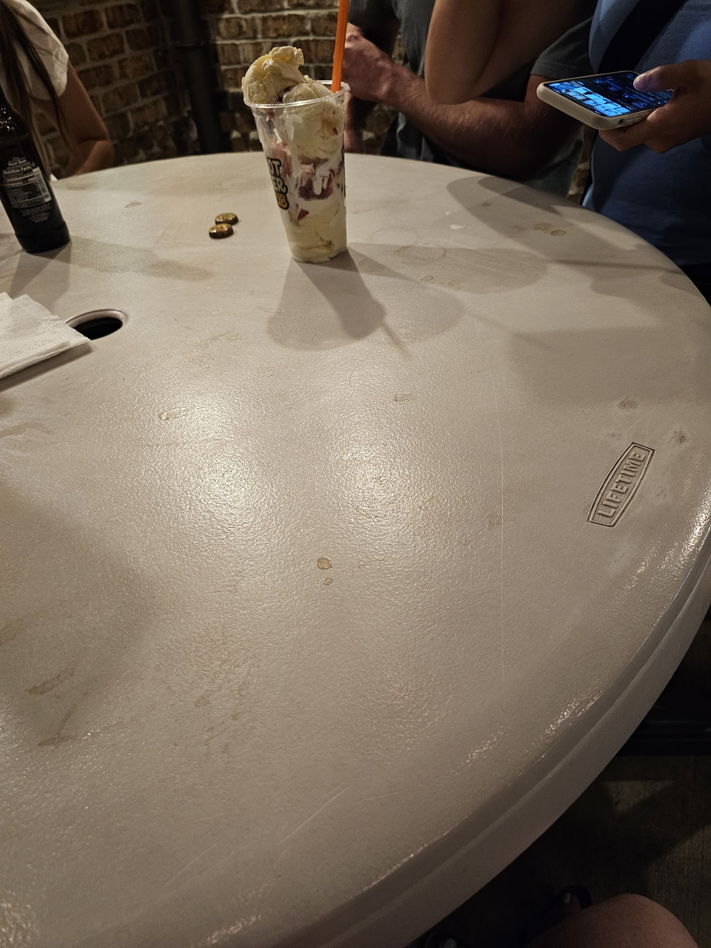 Seems super expensive for what you get, $9.00 for a few scoops of hard vanilla ice cream and a bottle of root beer. We got there before the rest of our group and there was no one else there, within minutes friends of the employees were taking up all the remaining parking spots so some of our friends had to park across the street. We walked up to order and one of the girls was talking loudly to her friend though the side window while we were ordering from a different girl then a random group of guys walked in the back as well. The girl taking our order says to the other girl "yah everytime my friends come it gets super busy too so I never get to talk to my friends". The tables were FILTHY, I went to ask one of the girls if they had something to clean off the tables and they handed me paper napkins and I told them that every table was gross and needed to be wiped down, a paper napkin wasnt going to cut it. One girl came out with cleaner in a bottle and a dry rag and proceeded to spray this nasty cleaner while we were all sitting there and she wiped off like 2 things and said the table was just "stained". The pictures on this review are from AFTER she wiped it off. One of the people in our group ordered a strawberries and cream, we were almost done with ours and we still hadn't gotten the strawberry one so we asked at the window (it had been over 10 minutes) and they said they forgot and would make it now, meanwhile the group of guys who went inside the place come walking out with their floats-one of which was a strawberries and cream. During this entire time friends of the employees are coming up to the windows and chatting with the employees and all the employees are sitting in there on their phones. Some more boys showed up and took the girls (that were working) on rides on their moped thing down the street and they were all out in the parking lot having a good chat. Absolutely wild. Trash is overflowing, tables are sticky and filthy concrete is sticky with spills but none of the girls working can be bothered. There's 4 parking spaces total, one is handicap accessible. There is a drive thru and 3 round picnic tables in the front. Bring Clorox wipes if you plan to eat yours there. It's also super loud with the traffic which isn't the establishments fault but it was very hard to have conversations. I get that it is hard to employ teenagers and to trust them but the absolute level of disrespect these kids have towards the people they work for is crazy. I don't think we will go back simply because of how dirty everything was and how distracted the employees were, I shouldnt feel like im interrupting girl talk to ask for my order. I truly hope the owners are able to find reliable, good help or have some more training and that these issues...