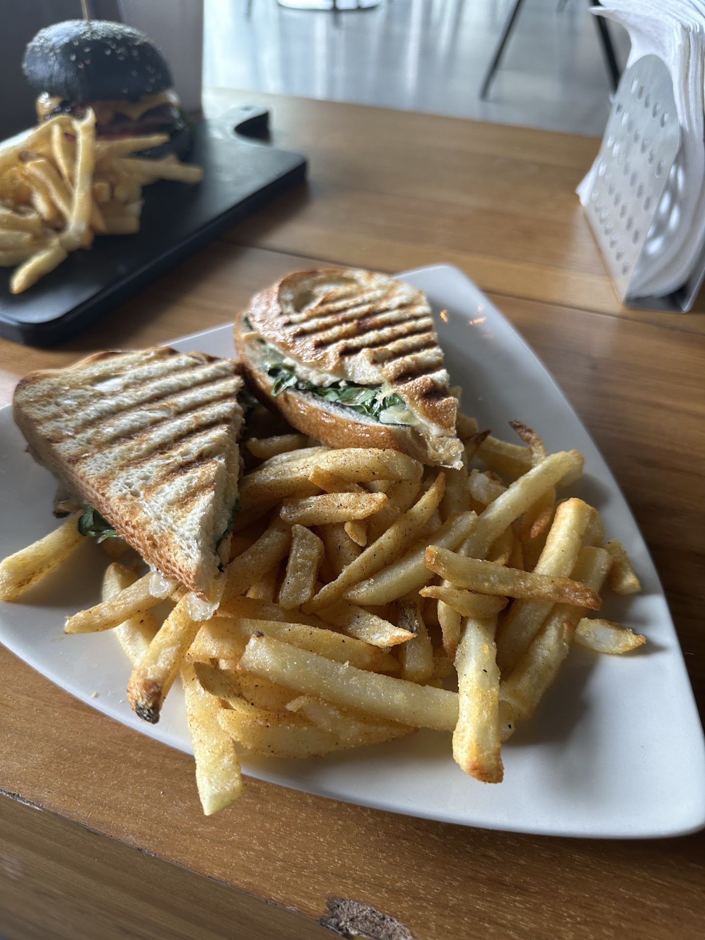 The black burgers bun was very dense and the patty didnât have much flavor. The fries were pretty good but nothing special. We got the panini half chicken and half steak which was awesome that they did that for us. The steak side was way better than the chicken side that was a little dry and flavorless. The chipotle burrito wasnât the best and even after bringing it home for leftovers it wasnât finished and ended up in the trash.