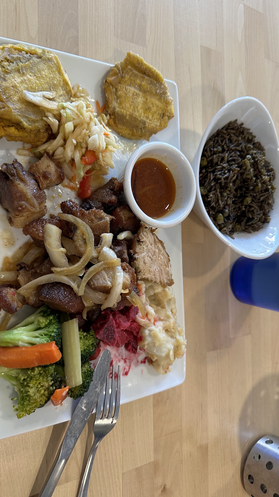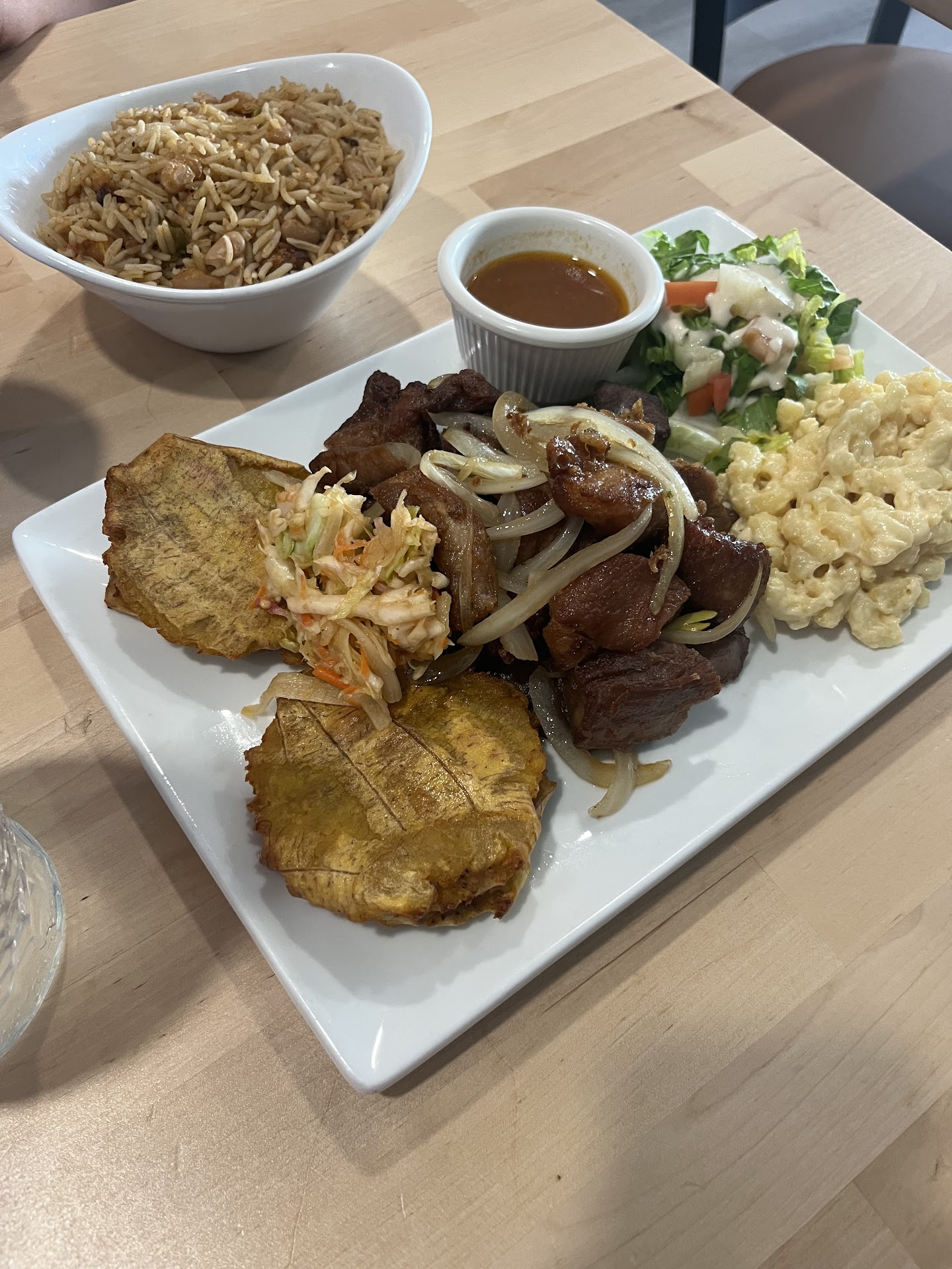 Read moreMy wife and I got the chicken plate (sauced) and griot plate. Our sides were rice with beans and patacones. We were really impressed. It was so good. The chicken was fall-off-the-bone and juicy in a nice sauce that included onions and peppers. The pork had a perfect crispy edge to it. The patacones were crispy and properly salted. The beans and rice rounded it all out. Plus, it comes with mac and cheese which is also tasty.