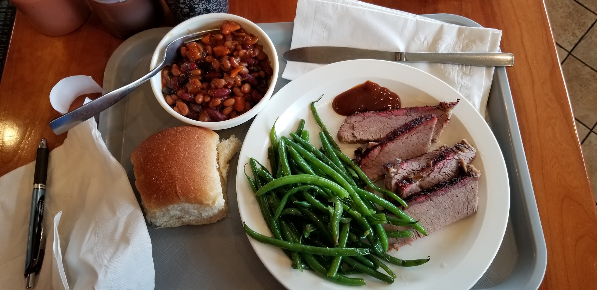 Read moreTop notch place, with great service to start the lunch hour. Better be early or you will be waiting in line. Had the lean brisket with baked beans and green beans, with a regular roll. So here goes the breakdown; The brisket was perfectly done. Though, since it was lean, not a lot on the flavor side of things, just the taste of a tender meat (Which was fine for me). I was satisfied with the meat. The bakes beans had a great twist with a three bean base and the addition of squash to the recipe. Fantastic in taste and compliments the overall dish. Now to the green beans. These were interesting. I had to have a few bites to really break down what I was experiencing. These beans seemed flash frozen, which preserves taste without the bitter taste that usually accompanies frozen veggies. With the inclusion of butter and onions, and you have a decent green bean dish. The roll was pretty basic and not much else... Overall I was satisfied with my meal and the...