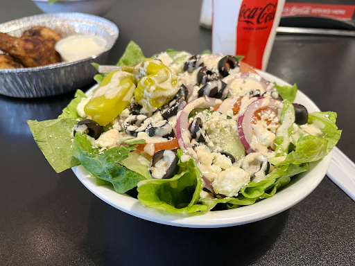 We ordered some salads, split an order of wings, and each got a slice. The garden and Greek salads had crisp, fresh veggies. My Greek Salad was dressed in a house-made dressing—something like I had never tried. It’s creamy and bursting with flavor. It's so good, in fact, that it found its way not only onto my salad but also as a dip for my pizza slice.