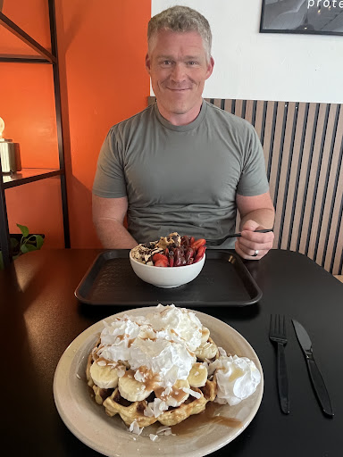 Looks like they went for a coffee house vibe which doesn’t really fit with the protein packed crowd. The food was basically all breakfasts and there’s bananas in all but two foods so if you don’t like bananas you probably won’t like this place. The peanut butter tasted like it had honey in it which was…interesting. The samoa protein shake looked chocolatey, but just tasted like protein powder with some coconut. The dopamine drink was alright, it tasted super sour and gross (like a crushed up vitamin c) after eating the waffle which wasn’t even overly sweet so that was odd. I also don’t like that they won’t list what makes it a dopamine drink. Does it have adaptogens? Is it just called that for fun? I guess we’ll never know. Also their pictures on the menu vary from what they serve like the banana pancakes had other fruit (👍🏼) and the yogurt comes with blueberries not raspberries (👎🏼).