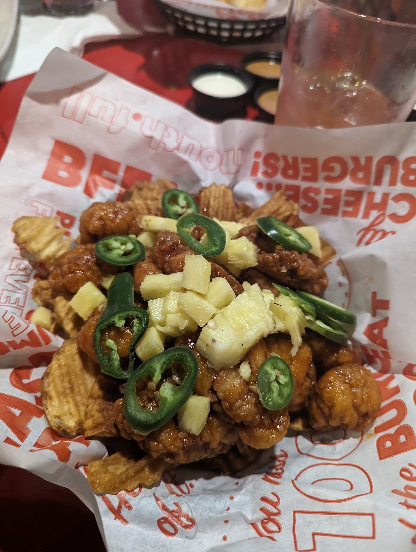 We pulled up to a specially-designated parking space for curbside pickup that had a sign instructing us to call a number so they could bring out the food. The employee who answered said that they don't do curbside pickup; we had to come inside. Ok fine, not really a big deal--it's what we had planned to do anyway. But they should really remove the signs if they no longer offer that service. When I got into the restaurant, I had to wait at the front for someone to come. When an employee finally noticed me, I said that I was here to pickup an order. She said to go to the bar, where there was a large "To Go" sign. When I got to the bar, I had to wait again until someone finally noticed me. They asked what I needed, and when I said I was here to pick up an order, they instructed me to go to the front. Eventually I was able to find my bag of food, but I'm not sure why I had to be bounced around like I was stuck in a slow-motion pinball machine When we arrived home and opened up our food, we noticed that (a) my burger was topped with a whole roasted jalapeno instead of fried jalapeno coins like the menu described (b) my burger was not even a little bit pink, and (c) they left the bleu cheese on my wife's chicken. The fried jalapeno coins were something I had really been looking forward to and they were a big factor in my choosing the burning love burger, so I was quite disappointed that instead all I got was a giant greasy pepper. I had been happy to see the option to leave my burger a little pink when I made my order. If it hadn't been an option, I wouldn't have cared. But since it was ostensibly an option, I was really excited to have it. To have an overcooked burger when I had specifically asked for slightly pink was incredibly disappointed. With the bleu cheese, it was a simple thing that we had specifically asked for. The employee assured us that it would be taken care of. At least she got us the ranch dressing.
