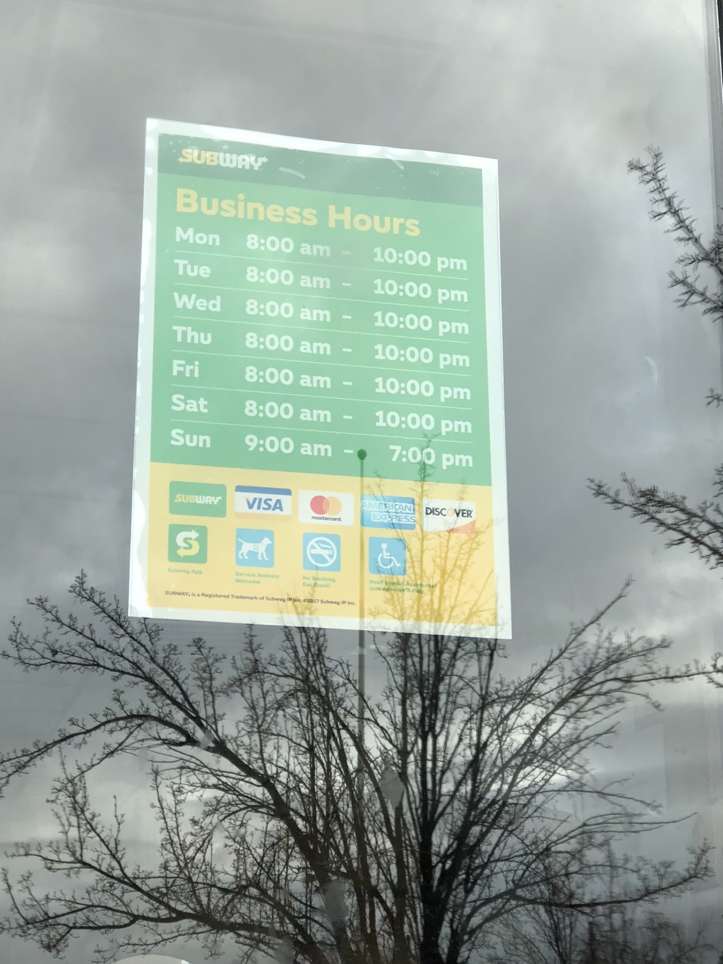 Read moreMe and my husband went here earlier today around 12ish. The woman we encountered was extremely rude to us after she misheard our order at the drive through. We ordered a kids meal and two other sandwiches, they had started making 3 footlongs which my husband noticed on the order board. He then tried to tell her it was wrong but she couldn't hear us and asked us to pull to the window. When she read the order back at the window we corrected her and she rudely asked "Well what DO you want then?" We told her that two of the sandwiches are correct, but we wanted a kids meal not a third footlong. She then walked to the counter and angrily threw the sandwich she had been making in the trash and literally refused to speak with us the rest of the time we were there. We did not treat her with any disrespect, but simply told her that she got the order wrong and asked that she correct it since my 5 year old isn't going to eat a footlong. We paid and left after getting our food. When we got home we realized that she had gotten the other two sandwich orders wrong as well, including the drinks. If you're going to work in a customer service oriented business, the least you can do is be polite and tactful. I've never been treated so disrespectfully in any establishment. Normally I don't write reviews, but I felt that this was really unacceptable, having worked in foodservice in the past I understand that it can be extremely stressful and I try to give the benefit of the doubt. However in this case I felt it was warranted, because of how...