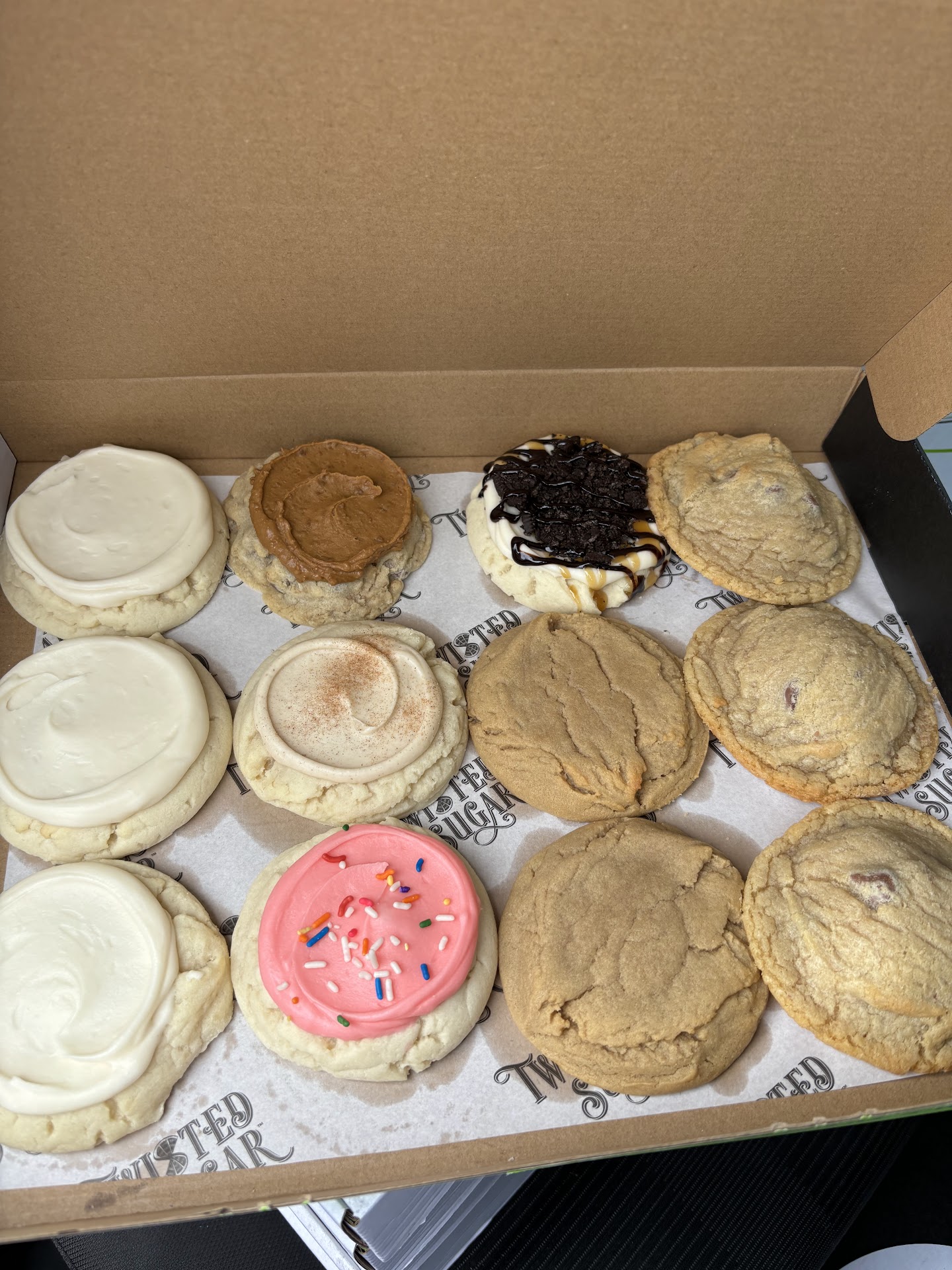 The old cookie companies can’t come to the phone right now. Y’all THIS IS THE COOKIE PLACE I HAVE BEEN NEEDING FOR YEARS. Twisted sugar puts a wonderful “twist” on the cookie company trend and does it so well that I think competition may go out of business soon. Their cookies all come chilled (the way a frosted cookie should be) and they aren’t so overly sweet that you get a tooth ache. The flavors that we have loved and return for are the lemon sugar, cookie butter cookie, banana cream pie, oatmeal chocolate chip, and dirtball. They have outstanding prices which realistically represent cookie appropriate pricing. Their original flavors are $1.85 and the more deluxe flavors are around $2.25-$2.65. They are smaller than other cookie companies in the area but they are definitely regular dessert size.