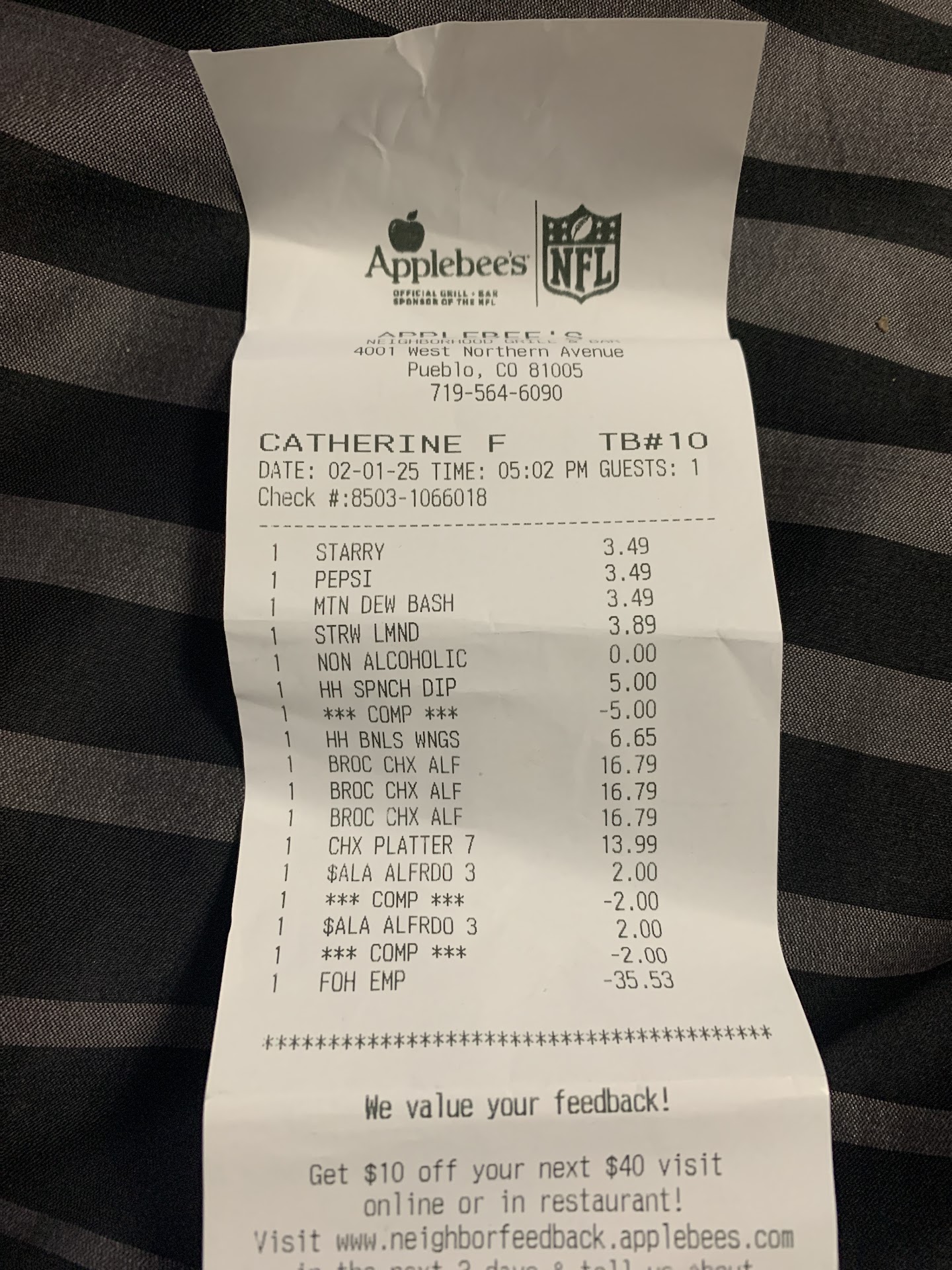 My spouse took me to a birthday lunch. Applebee's is one of the very few places in Pueblo, that serve steak for lunch, and a steak was what I wanted. It was cooked to perfection, just the way I wanted. And I was accommodated on my choice of a side dish, when I asked for the red bell pepper to be removed. Service was quick, polite, and professional. Nice way to spend an hour.