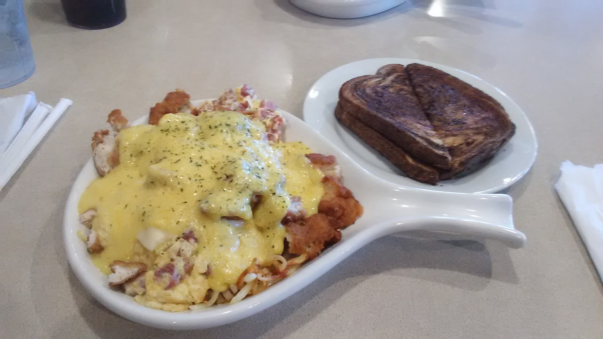 Read moreThis place is one health code violation, after poor management, after a sad excuse for a head cook. We placed a to go order, and we were told 15 minutes. Arrived approx 15 min after placing the order and food had not been started. Kitchen staff was so loud, and over heard saying "ok that employees order is out now for this "to go."" The hostess was no where to be found for over 20 minutes. In that time a server rang up the order and not realizing what her role was at the restaurant I placed 4$ in the tip jar at the hostess stand. Not 2 minutes later the "manager" walks up takes the tip out of the jar and puts it in the actual hostess tip cup. Instead of giving it to the waitress that provided the service. Back to the kitchen. The "head cook" apparently doesn't know the menu. Both items came with pancakes. He only put down one order. And again the server not the host asked where the other set was. Took the kitchen over 12 minutes to make 2 pancakes. This was probably due to the "head cook" pecking food off the line and eating with his bare hands right in front of the service window for me to see. At first I though it might be gum. But he would leave the window not chewing and come back with a fresh bite of food. Slow/ sloppy cooks, missing/ mis-asigned staff, manager and dishwasher glares for the looks of disbelief at the "head cook" eating on the line. Health department needs to go in and observe this "spit show" and shut them down. Friday night and only 2 tables with people at them....