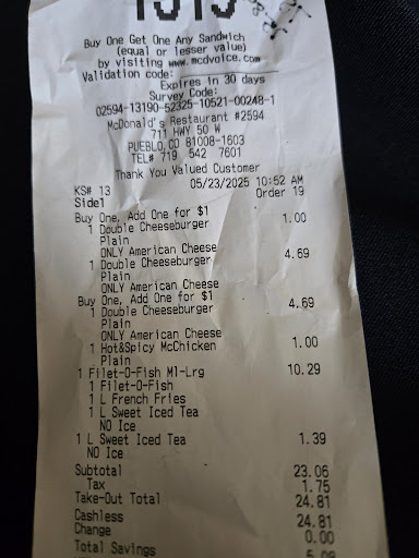 Read moreHorrible service. Waited 15 minutes and still never received our meal. All the staff did was wait on people in the drive thru. Asked to speak to a supervisor three times. The female employee at the coffee machine did was wait on the drive up. No supervisor ever came to see what we wanted. A new employee placed the French fries in a bag although we told her that we were going to eat in. French fries stood in the bag 15 minutes and not under the warmer. Waited and waited, a male Mexican employee came behind the counter and argued with another employee then got the order that sat on the counter for over 15 minutes and proceeded to give it to us. We asked him to speak to a manager. He said, "I'm the manager." I told him that we asked to speak to a Manger three times, no manager came or was called. I told him that I wanted a refund because our order sat on the counter for over 15 minutes. He said: "you want refund?" Walked over to the register, got my refund and said, "sign this!" Then he walked away. Sign with what, my finger??? Got, out to my car and there were 4 cars in the drive up. Oh no... Let's not make them wait, just the customers who stand in the lobby for over 15 minutes, watching all the drive up customers being served. Mr. NAPIER, you need to pay your McDonald's a surprise visit and see how horrible customers are being treated!!!!!!! There is NO EXCUSE.... Your male manager was outside, your female maanger on the French fries and customers are walking. I will boycott McDonald's and go elsewhere, the way I did tonight. Time of visit: 8:16pm..... I highly suggest that you pull the refund ticket and the surveillance tape and you will see with your own eyes OUR EXPERIENCE!!!!! YOUR STAFF IS GOING TO SAY, WE WERE WAITING ON THE FRENCH FRIES, THE WAY THAT THEY TRIED TO TELL US. FRENCH FRIES DO NOT TAKE 15 MINUTES TO COOK. IF THEY DID, YOUR DRIVE UP WOULD HAVE BEEN BACKED UP DOWN HWY 50......