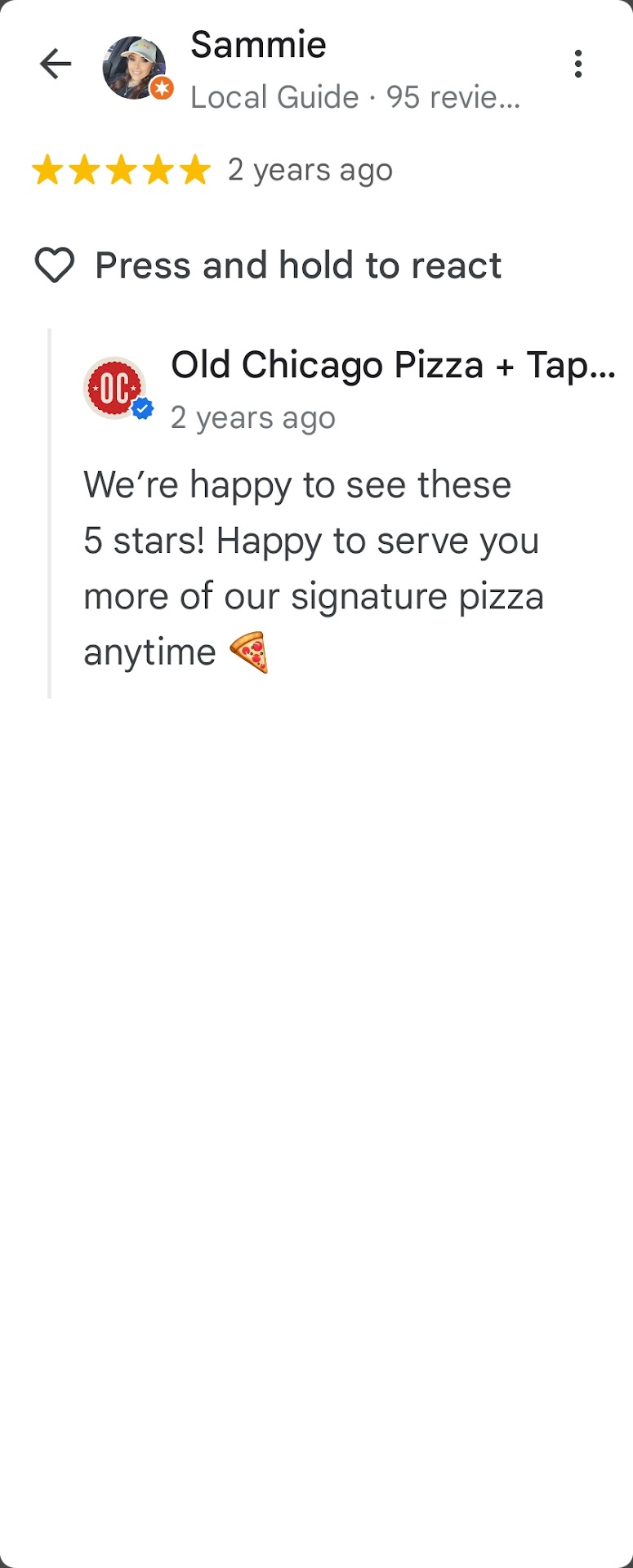 Read moreHOW IS THIS PLACE EVEN STILL OPEN Well, about 6 months after the terrible ordeal we went through with old Chicago. We decided to try to give them another shot since we couldnt get a table at thunderzone we knew our last experience was bad and went anyway as a last resort this was really a time we hoped they would redeemed themselves. Again, terrible service probably almost an hour of waiting to get our drink or food orders should of been 5 of us walking out, burnt unedible food over 2 hours later was quote on quote remade but was actually the same food re servered just added stuff to look like it was remade the food came out over burnt and over cooked and was cold so it had to be sitting for a while because it look like charcoal but cold and food was missing we honestly paid and left and went to little ceasers hot and ready and got a pizza premade which was edible